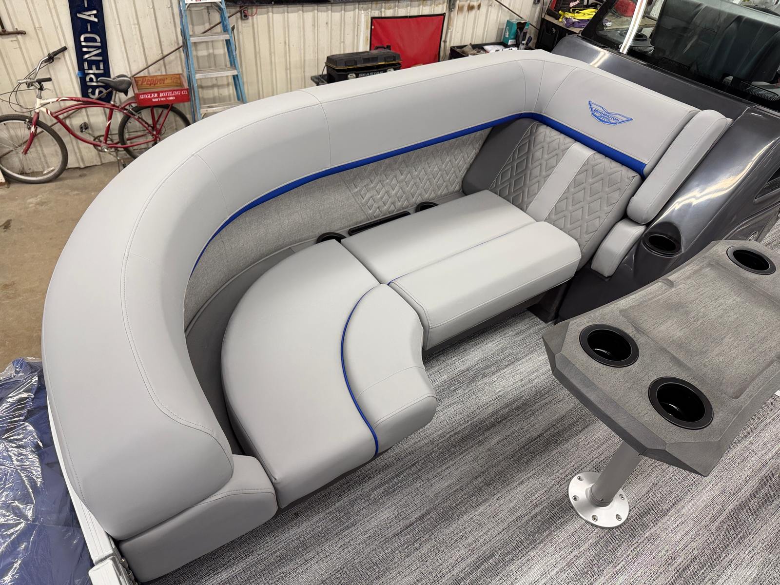 The 2026 Bennington 22 MFB SPS pontoon stands out with its impressive 24.25-foot length, offering ample space for relaxation and socializing. As a new Bennington boat for sale, this model showcases the brand’s commitment to craftsmanship, comfort, and cutting-edge design. The sleek exterior features a Smooth Metallic Luminous Blue panel with Smooth Metallic White accents, complemented by a sophisticated Shoreline Grey finish. Inside, the Luminous Blue Simtex interior accent adds a touch of elegance and modern flair, creating a welcoming atmosphere for every adventure.