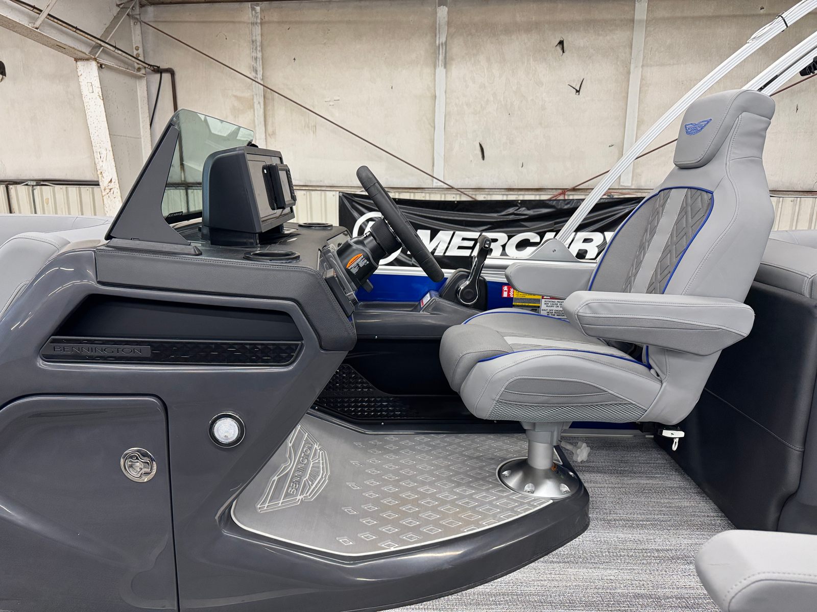 The Bennington 22 MFB SPS is loaded with special features that elevate your boating experience. The exterior’s Smooth Metallic Luminous Blue panel and Smooth Metallic White accent create a striking visual impression, while the Shoreline Grey finish adds a touch of sophistication. Inside, the Luminous Blue Simtex interior accent provides both comfort and style, making every seat the best in the house.This pontoon is equipped with a Removable Flag Pole with an American Flag, allowing you to showcase your patriotic spirit as you cruise the waterways. The Bimini - Electric Power Top Curved 12B S/M Slv offers convenient, push-button shade, ensuring you and your guests stay cool and comfortable even on the sunniest days. The Elevated Console with Pocket Mythos provides a commanding view and additional storage, keeping your essentials organized and within reach.