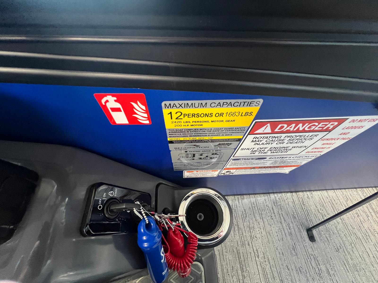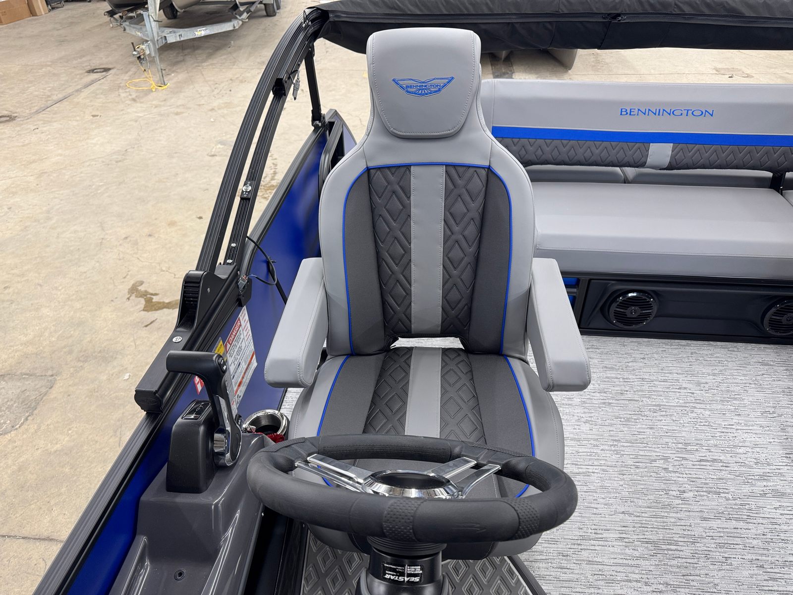 This Bennington pontoon boat is packed with special features designed to enhance your time on the water. The smooth matte Luminous Blue panels and Smooth Gemini Black accents create a striking exterior, while the Graphite Veneto and Luminous Blue Simtex interior accents provide a comfortable and inviting atmosphere for you and your guests. The elevated console with Pocket Mythos offers improved visibility and convenient storage, making navigation and organization effortless.Enjoy shade and protection from the sun with the Bimini - Electric Power Top Curved 12B S/M Blk, which can be easily adjusted at the touch of a button. The removable flag pole with American flag adds a patriotic touch, perfect for holiday weekends and special occasions. The single switch battery with fuse ensures reliable power management, giving you peace of mind during every outing.