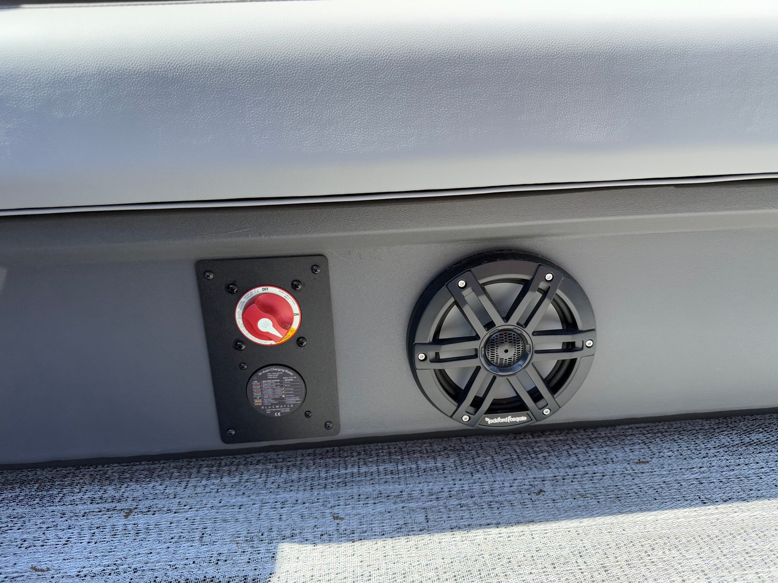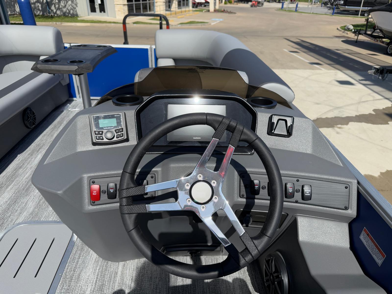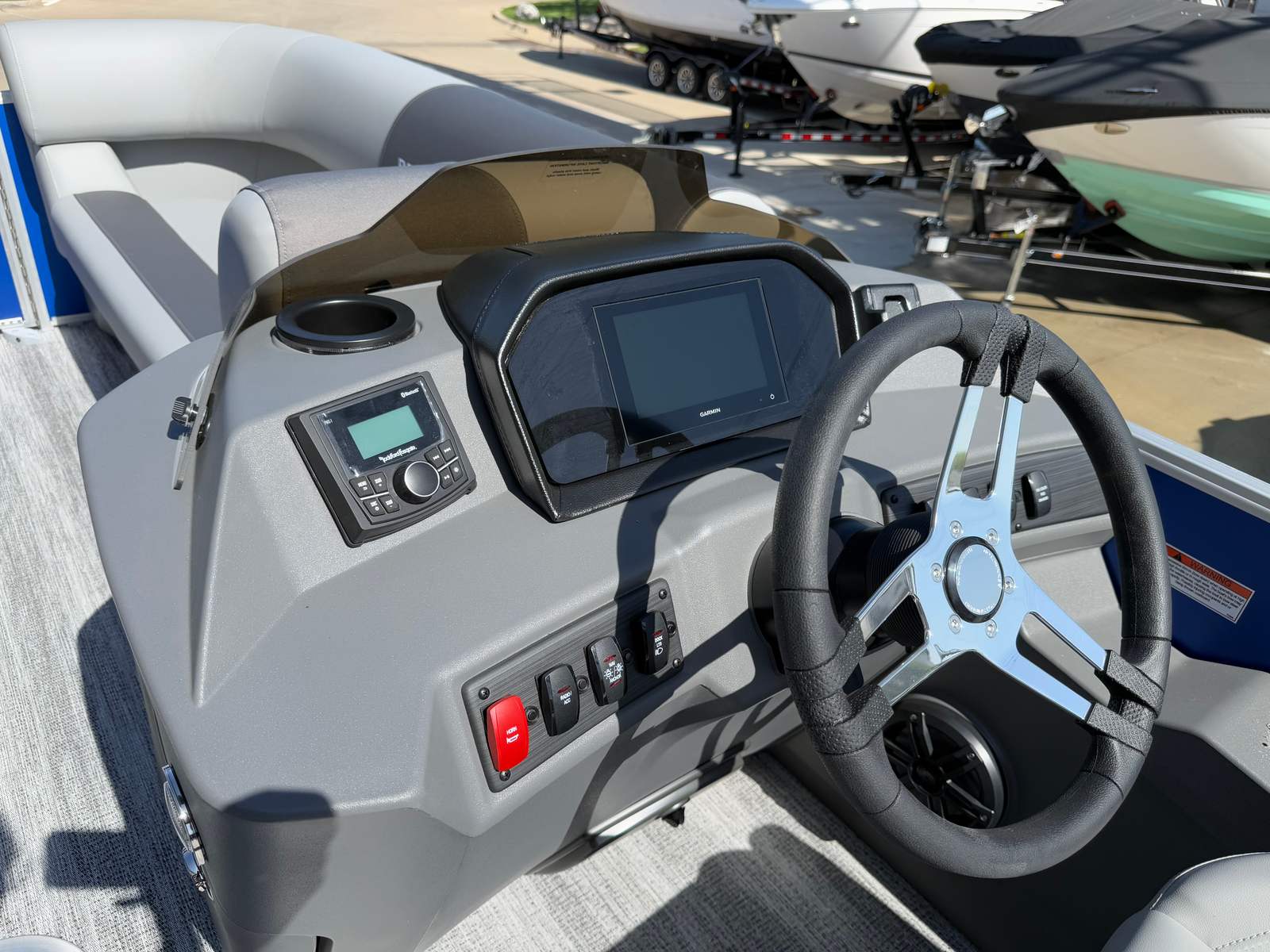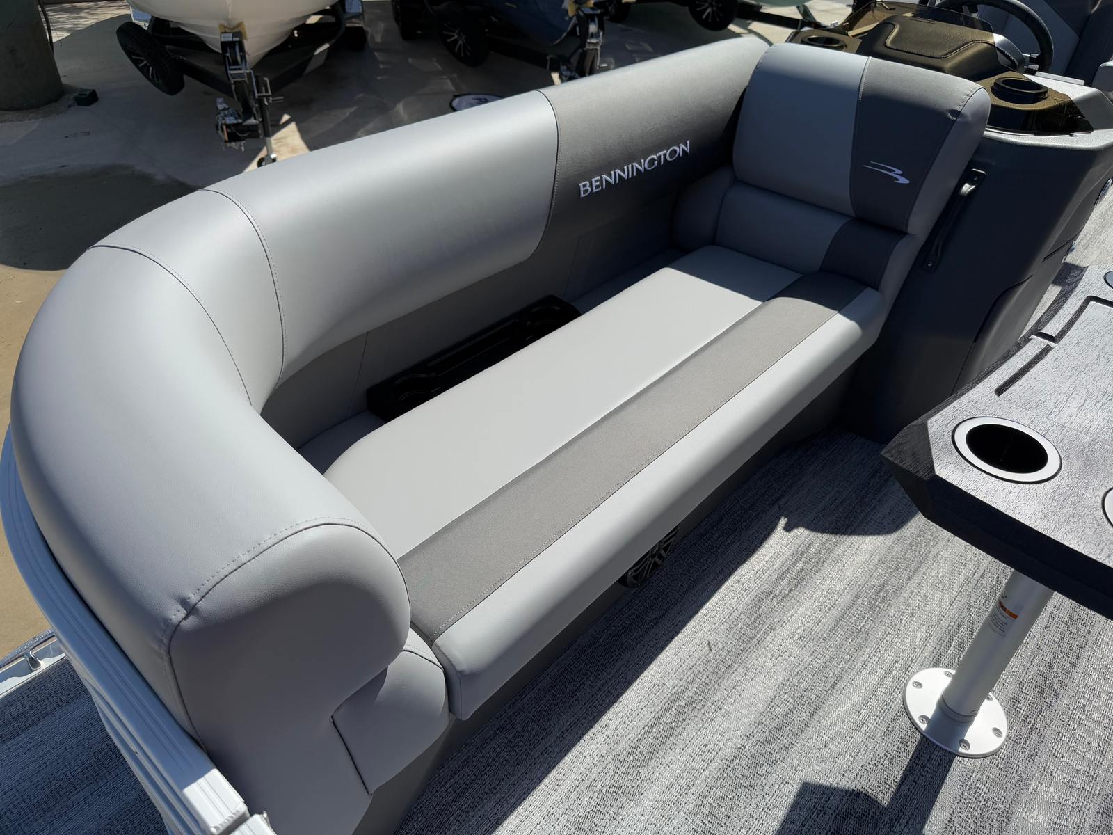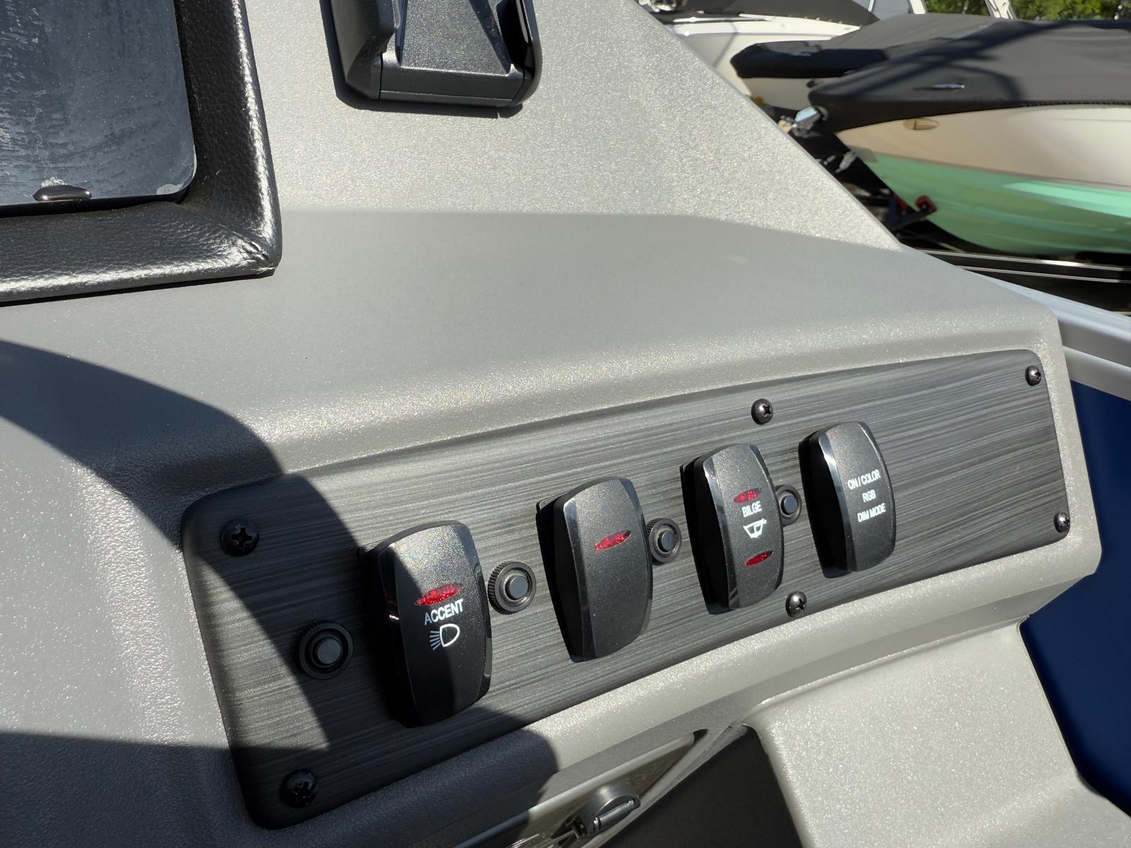 The Bennington 22 SSR SPS is loaded with features designed to enhance your time on the water. The dual battery switch with fuse provides peace of mind, ensuring you have reliable power for all your onboard electronics and accessories. Lighted cupholders add a touch of elegance and convenience, keeping your favorite beverages secure and illuminated during evening cruises.For those who love music, the Rockford Fosgate 6.5" M1 lighted speakers (four in total) with an RGB control upgrade deliver premium sound quality and customizable lighting to match your mood or the occasion. The Serene Soft Touch Vinyl with Simtex accents offers plush, comfortable seating that is both stylish and durable, making long days on the water a true pleasure. The Ironwood dash accent adds a refined touch to the helm, while the overall color palette of Shadow Grey and Carbon creates a cohesive and upscale look throughout the boat.