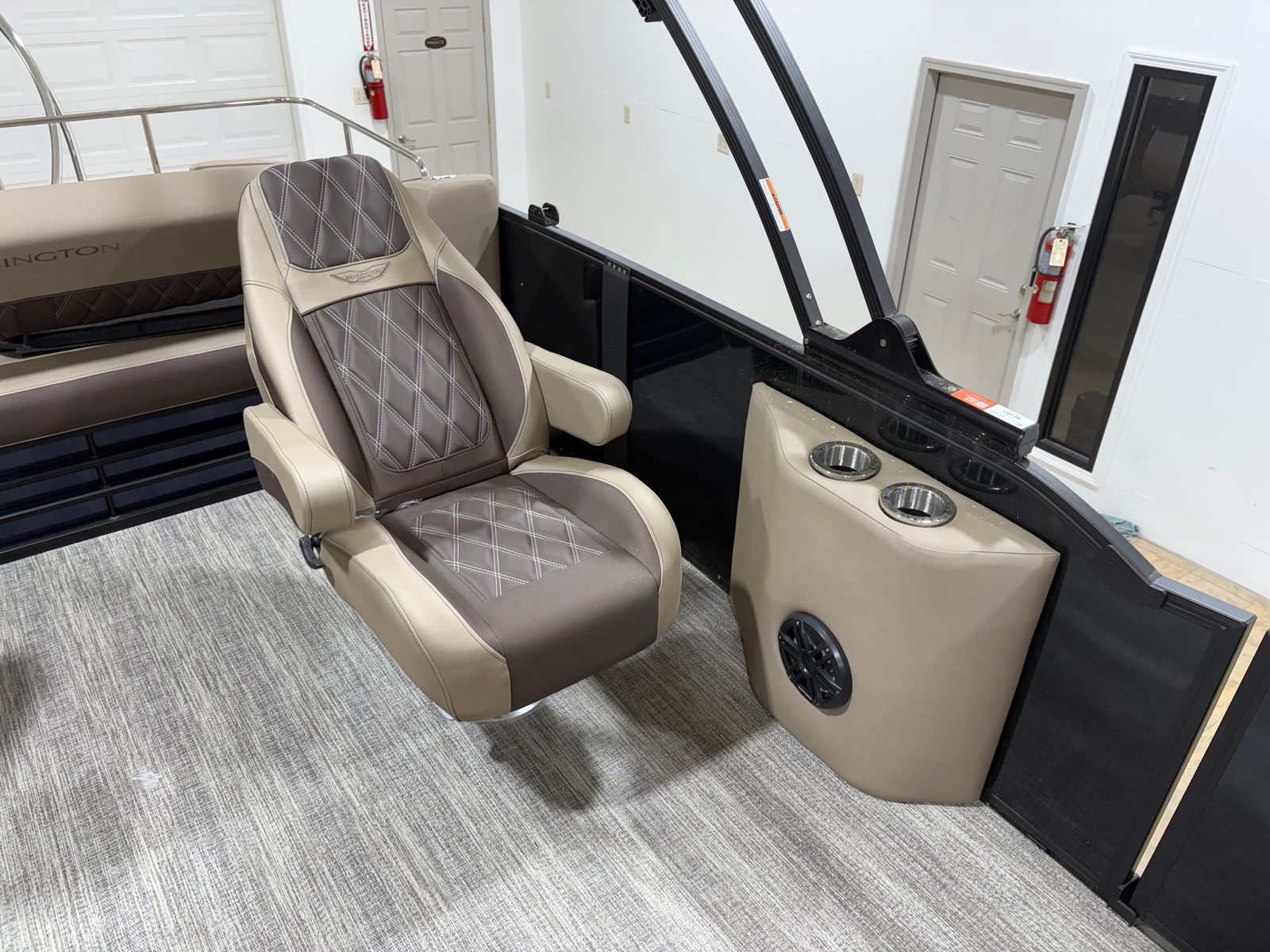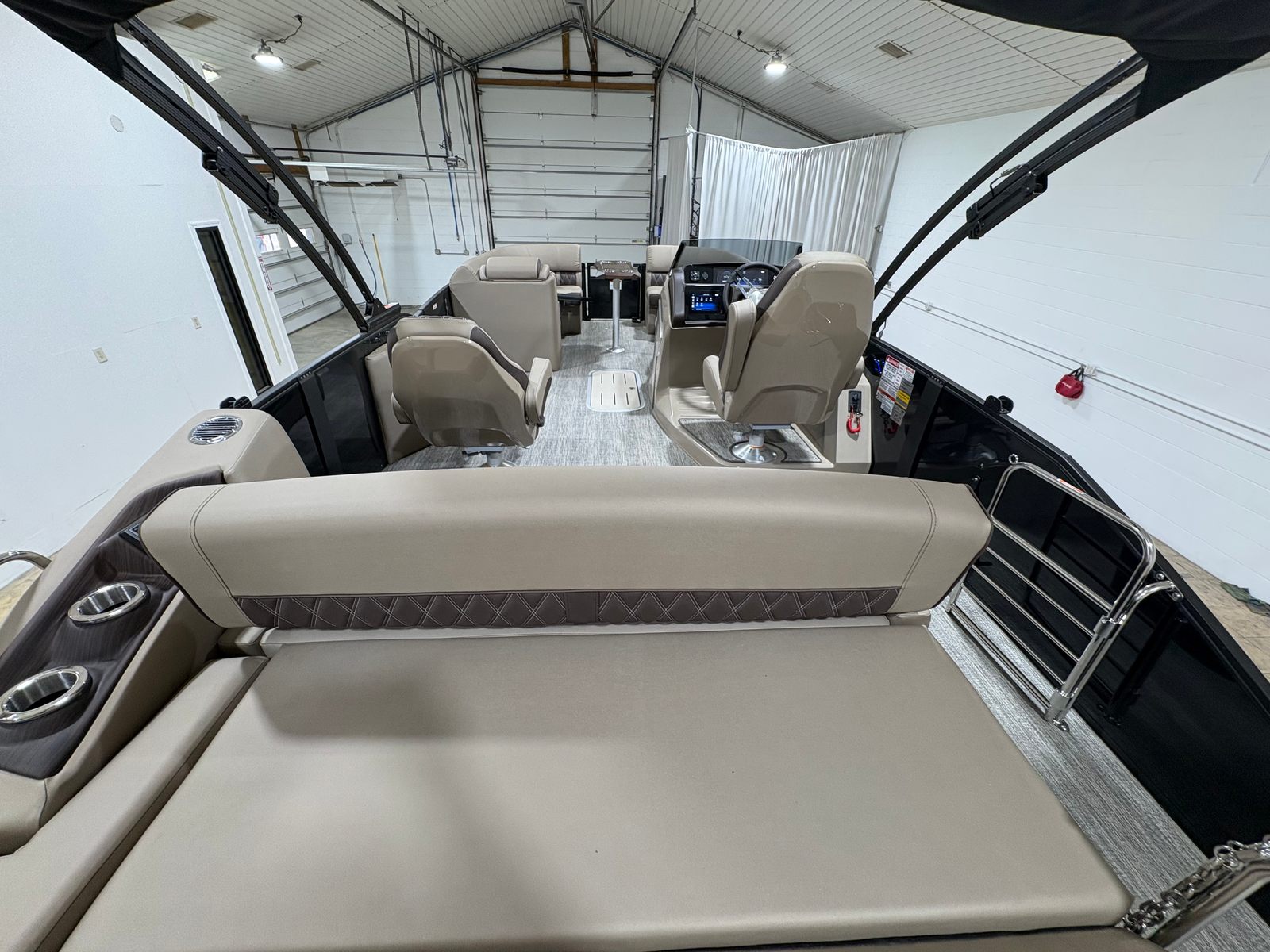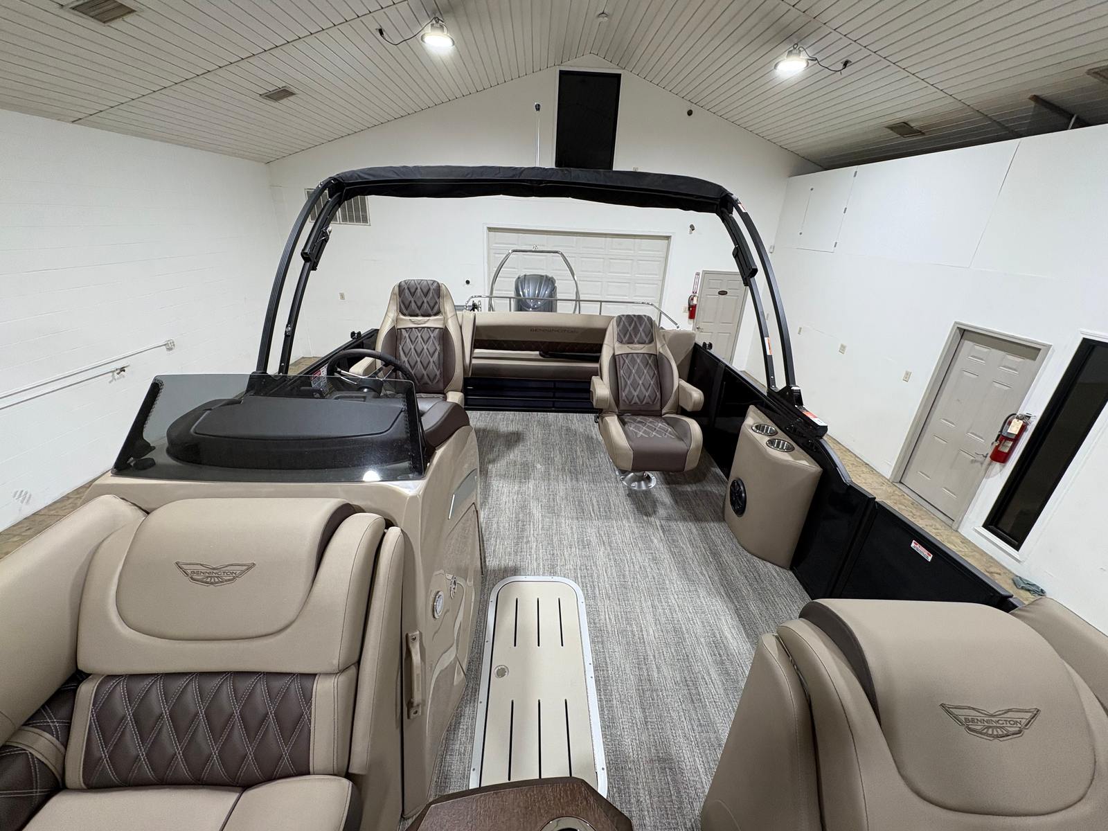 This Bennington boat for sale is loaded with special features designed to elevate your boating experience. The Bow Pop-Up Cleats offer convenient and secure docking, while the Elevated Console Platinum provides enhanced visibility and a commanding view of your surroundings. Exterior Side Lighting not only adds a touch of elegance but also improves safety during evening cruises. The Accent - Smooth Gemini Black finish gives the pontoon a sleek, modern look that is sure to impress.Inside, the Stowable Sculpted Rectangular Table Upgrade creates the perfect setting for onboard dining or socializing, and the Battery: Power Distribution Panel ensures reliable power management for all your electronic needs. The Shoreline Taupe color scheme exudes sophistication and blends seamlessly with the natural beauty of your favorite waterways. The Swingback Plus LX (Co-Captain Seat) offers flexible seating arrangements, allowing you and your guests to relax in style. For those who love water sports, the Ski Tow Bar (Ext. Aft Deck with Rub Rail) makes it easy to enjoy tubing, skiing, or wakeboarding. The Stainless Steel Keeper Rail adds an extra layer of safety and durability, ensuring peace of mind for you and your passengers.
