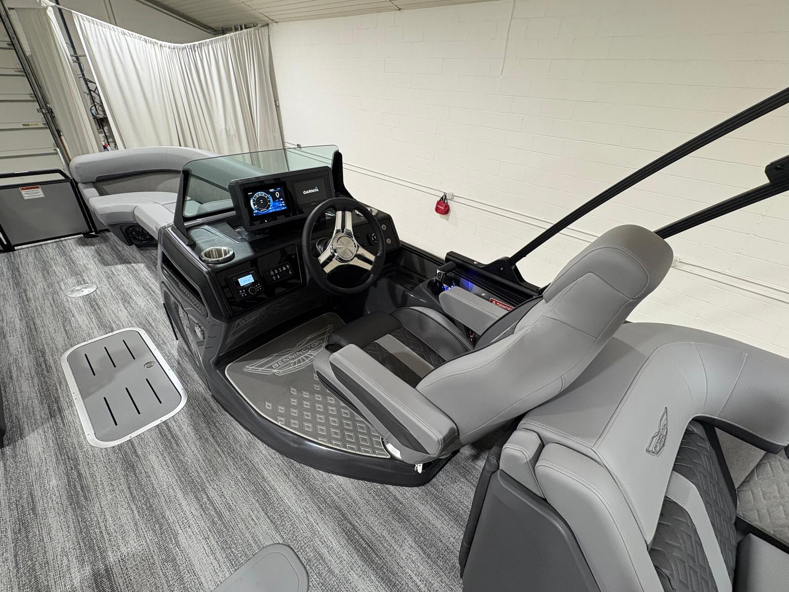 The Bennington 24 MFB ESP is packed with premium features designed to elevate your boating experience. The Elevated Console Mythos offers enhanced visibility and a commanding view of your surroundings, making navigation both intuitive and enjoyable. The Bimini - Electric Power Top Curved 12B S/M Blk provides effortless shade at the touch of a button, allowing you to adapt to changing weather conditions with ease.Exterior Side Lighting and the Blackout Luxe Package add a touch of modern elegance, ensuring your pontoon stands out both day and night. The Chaise Convenience Table creates a perfect spot for snacks and drinks, while the Canvas - Midnight Black and Interior Accent - Mythos Grey Simtex deliver a sleek, contemporary aesthetic. Black Logos and Toekick Lights (2-41" and 2-62") enhance the boat’s visual appeal, especially during evening cruises. The Port Bench Exchange maximizes seating flexibility, ensuring everyone on board enjoys comfort and convenience.