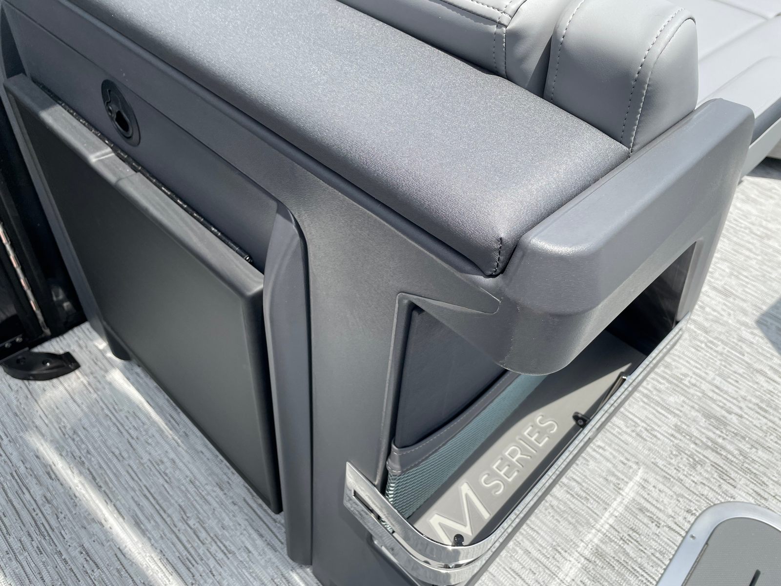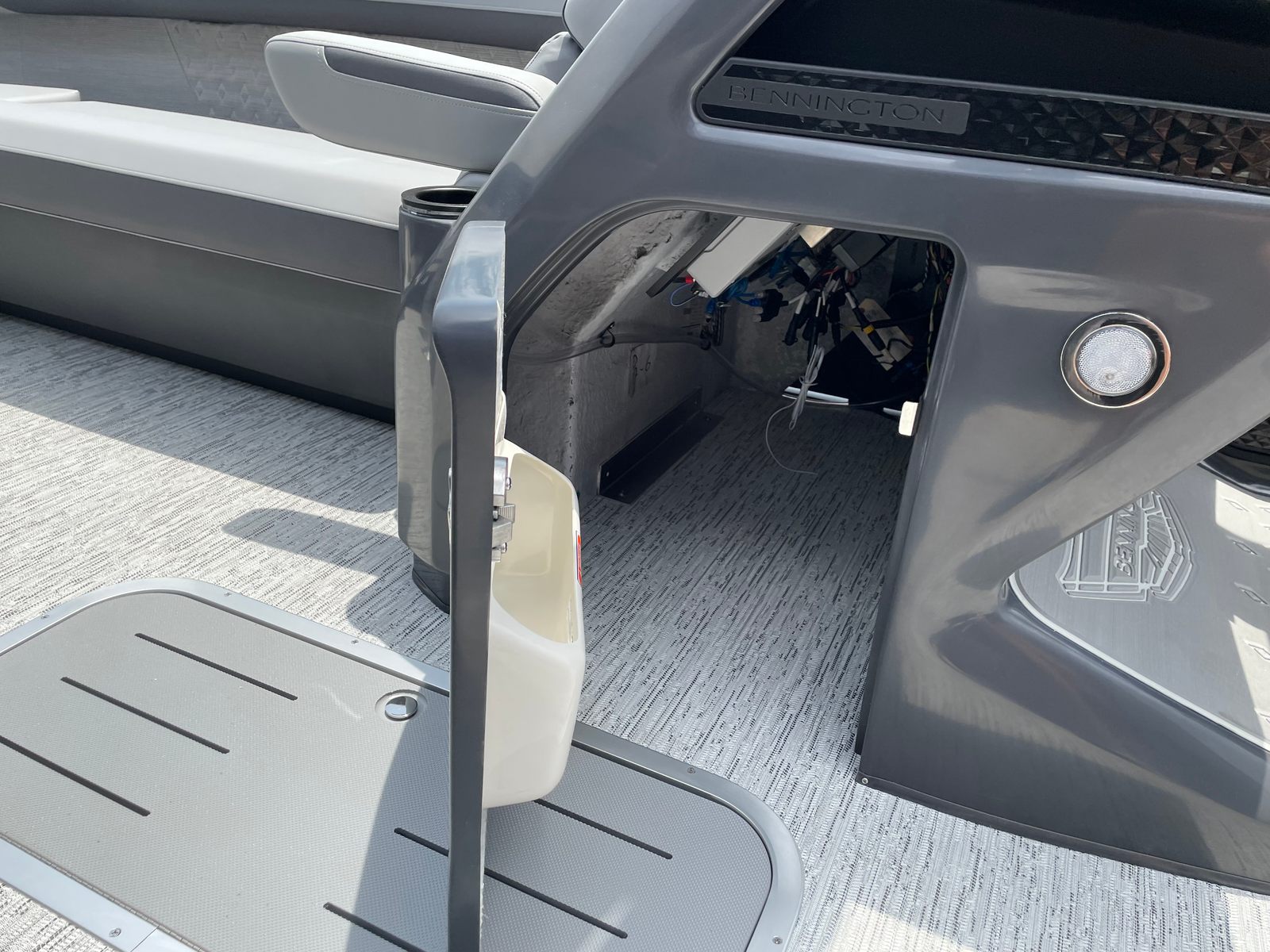 The Bennington 24 MFB SPS Plus is loaded with special features that elevate your time on the water. Enjoy a vibrant atmosphere with RGB speakers that let you set the mood with customizable lighting and high-quality sound. The toekick lights, with two 41-inch and two 62-inch fixtures, add a stylish glow to the deck, while lumbar lighting enhances both safety and ambiance during evening cruises. The Sport Furniture M Series provides plush, ergonomic seating for maximum comfort, and the Zebrawood Matte Slate accents add a touch of modern elegance to the interior.For those who love water sports, the ski tow bar makes it easy to enjoy tubing, wakeboarding, or skiing with friends and family. The Valencia Grey color scheme gives the boat a sophisticated, contemporary look, complemented by the black rub rail insert for added durability and style. Every detail of the Bennington 24 MFB SPS Plus is crafted to deliver a premium boating experience.