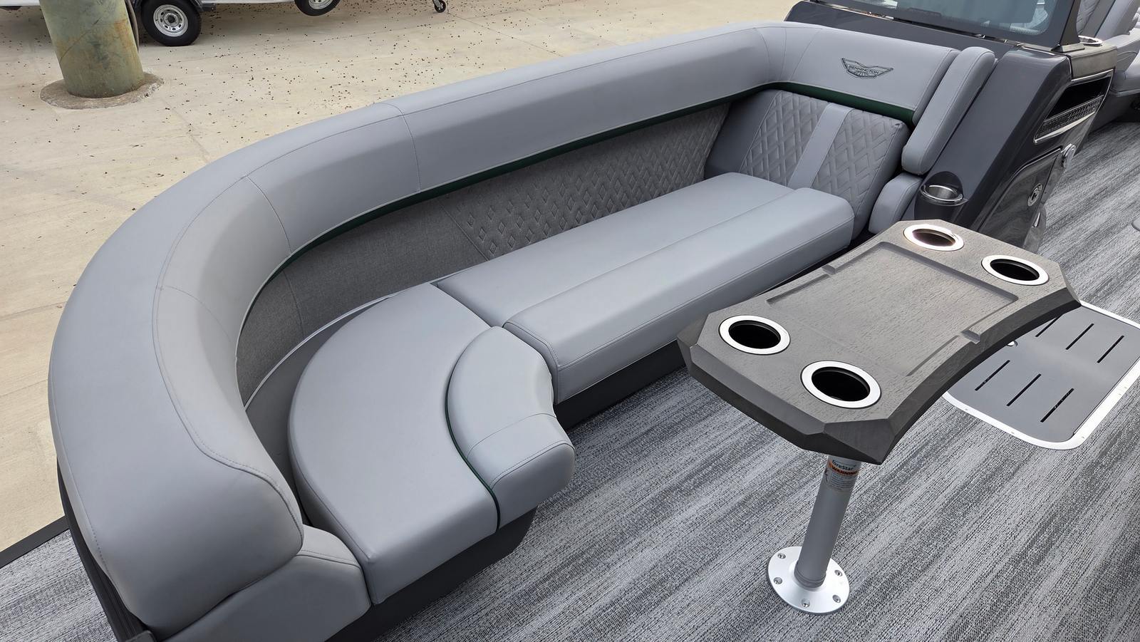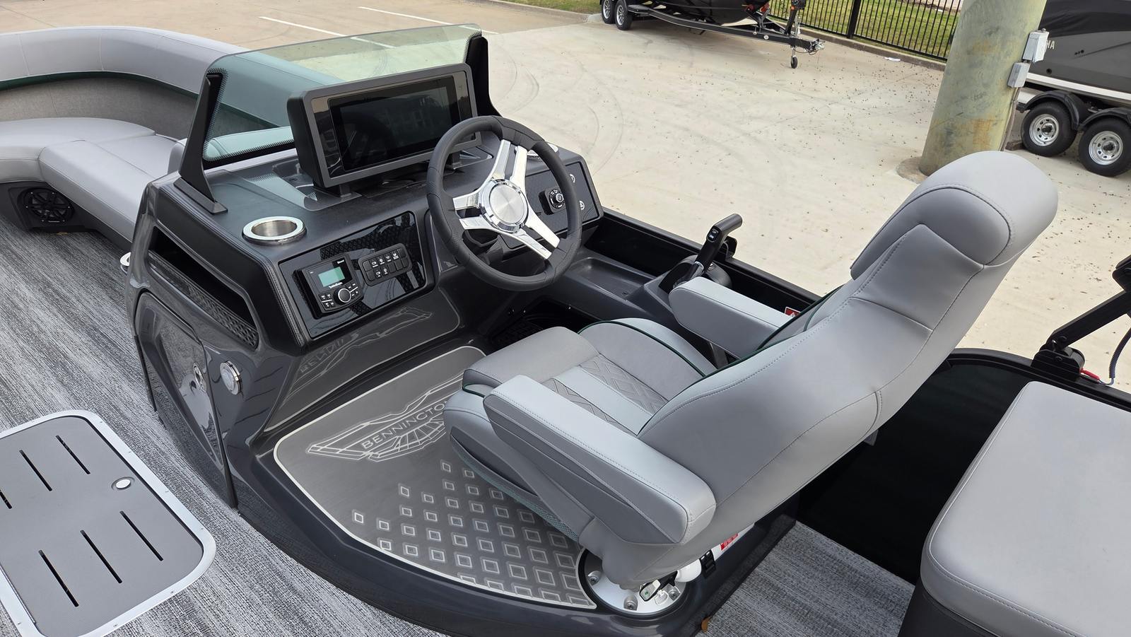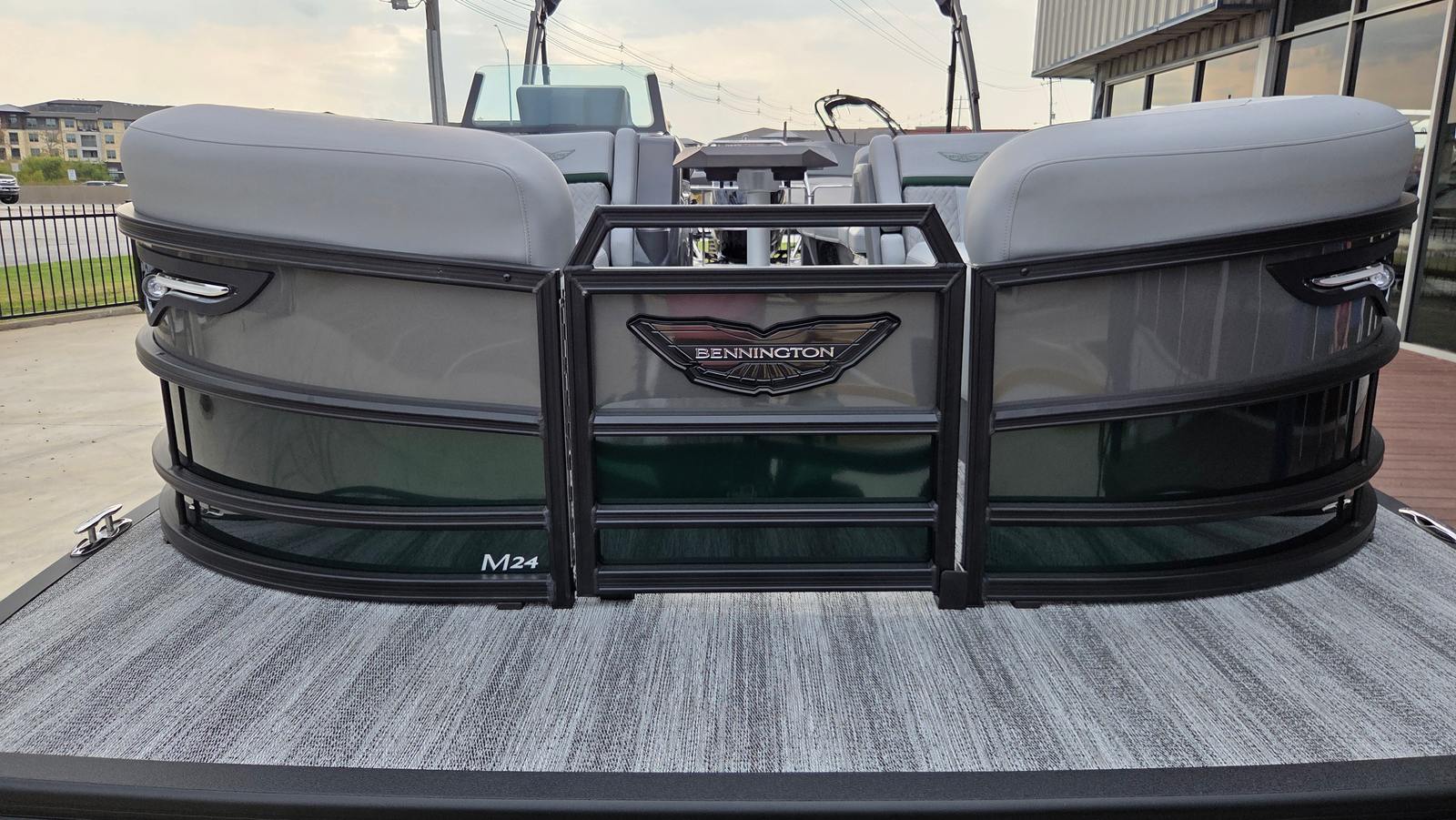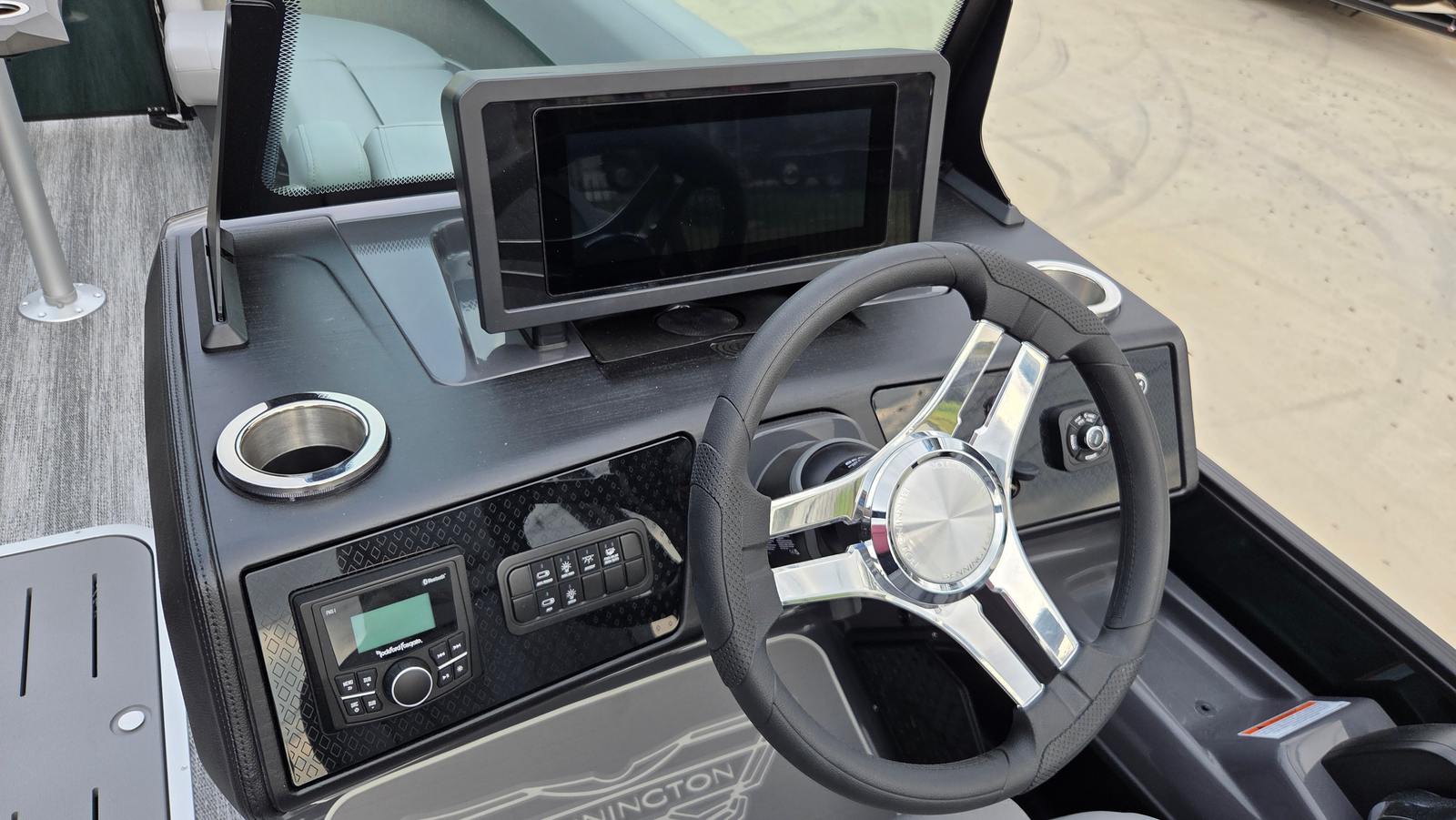 The Bennington 24 MSL SPS Plus is loaded with features that elevate your on-water experience. The RGB Control M Series lighting system allows you to set the perfect mood, while the Toekick Lights (2-62") add a subtle, stylish glow for evening cruises. Entertainment is taken to the next level with six Rockford Fosgate M1 Lighted Speakers, delivering crystal-clear sound and vibrant illumination for your favorite playlists. Illuminated cupholders keep your beverages secure and visible, even after sunset, and the Elevated Console with Pocket Mythos provides a commanding view and convenient storage for your essentials. The addition of lumbar lighting enhances comfort and ambiance, making every seat the best in the house. For sun protection and style, the Bimini - Curved M/LXS No Light Blk offers ample shade without compromising the boat’s sleek profile.