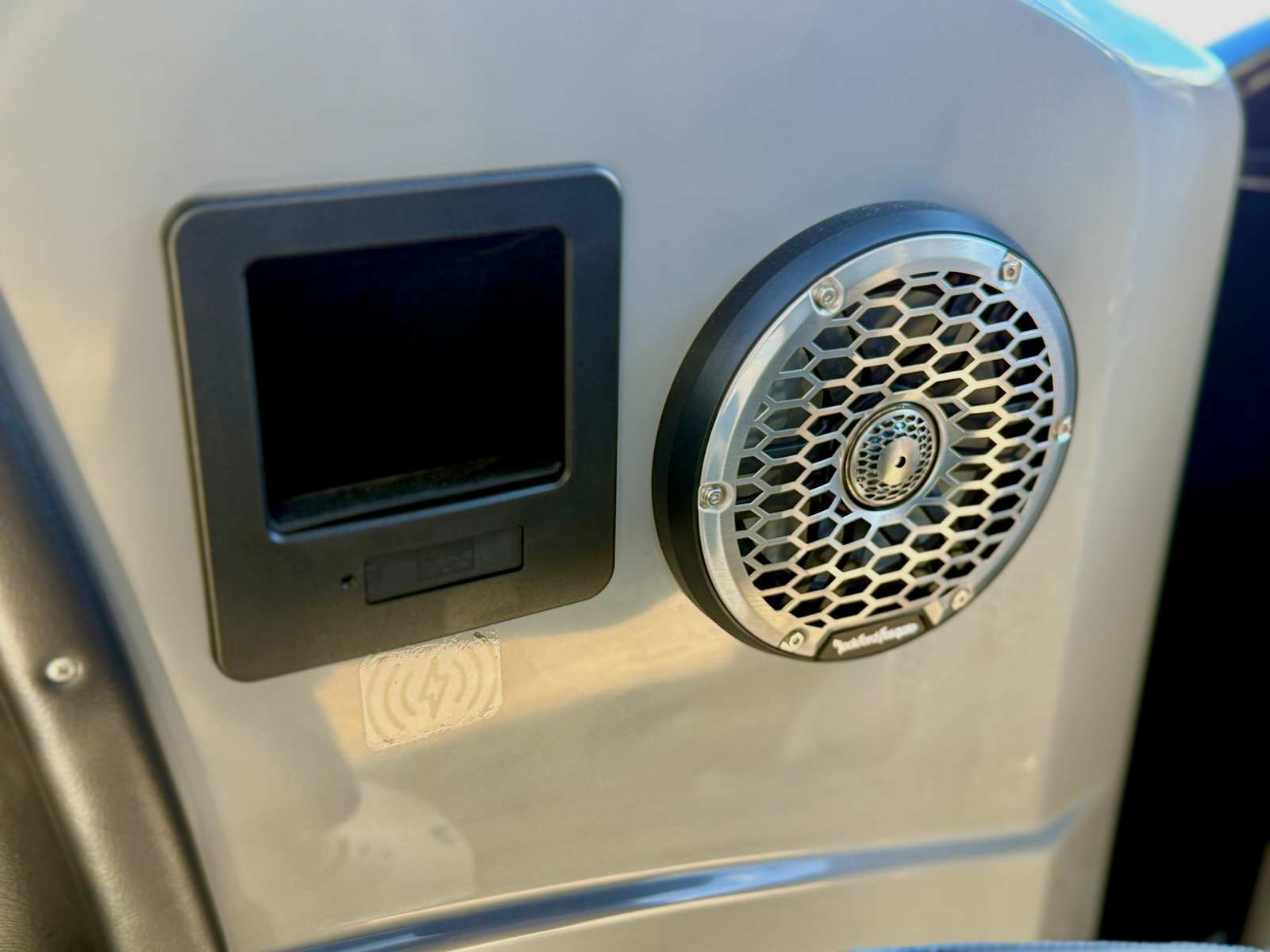 The Bennington 27 QXFBWAX2 ESP is loaded with special features that set it apart from other pontoon boats for sale. The Sunshine Package ensures that every outing is bright and cheerful, while RGB Toe Kick Lighting (R/RX/Q) adds a vibrant, customizable ambiance to the deck. Nine illuminated cupholders keep your favorite beverages within reach and glowing after sunset, enhancing both convenience and style. Exterior side lighting and underwater lighting create a striking visual effect, making your boat stand out during evening cruises or dockside gatherings.Blackout logos give the boat a modern, sophisticated look, while the Rockford Fosgate audio system transforms your pontoon into a floating entertainment hub. Enjoy six 6.5" M2 speakers, two 8" M2 speakers (Fastback), a powerful 10" M2 subwoofer, and a dual PM Punch amplifier upgrade for crystal-clear sound and deep bass. The interior features Graphite Simtex upholstery and accent details in perforated metallic carbon, offering both comfort and contemporary flair.