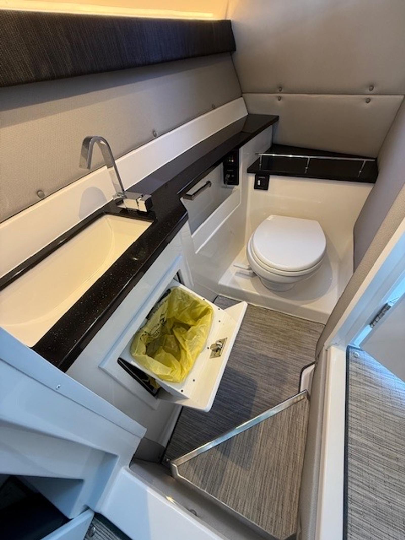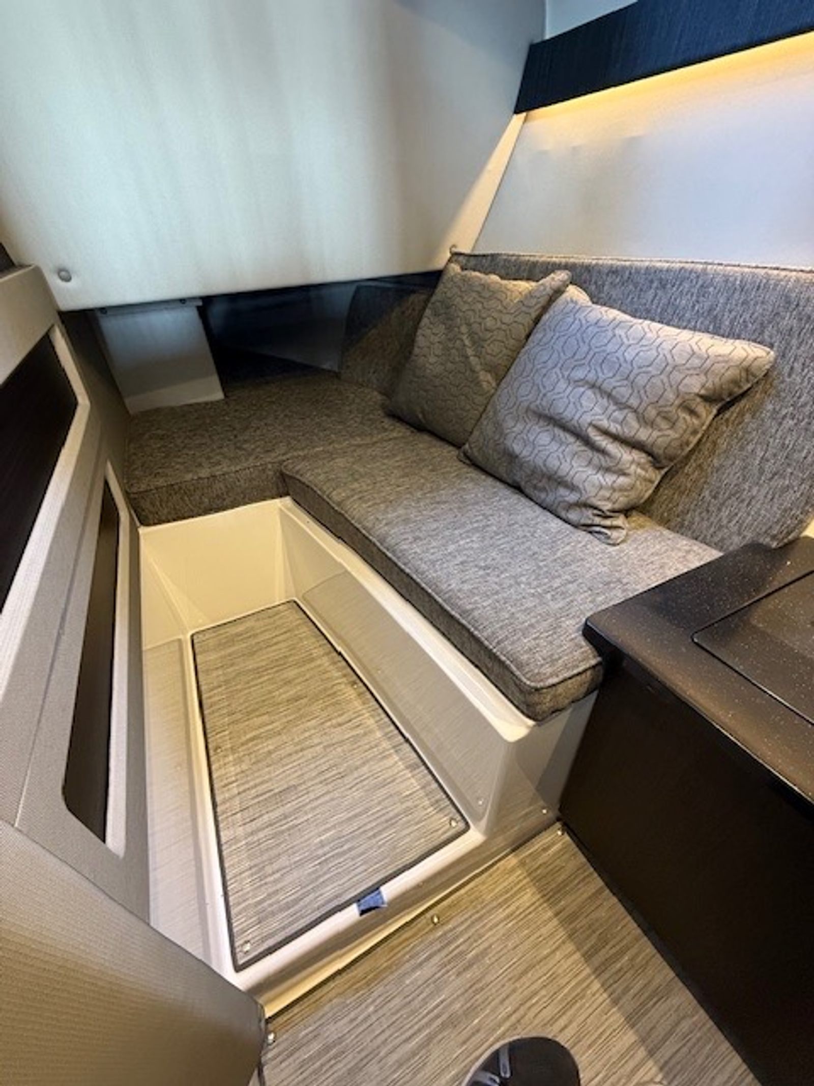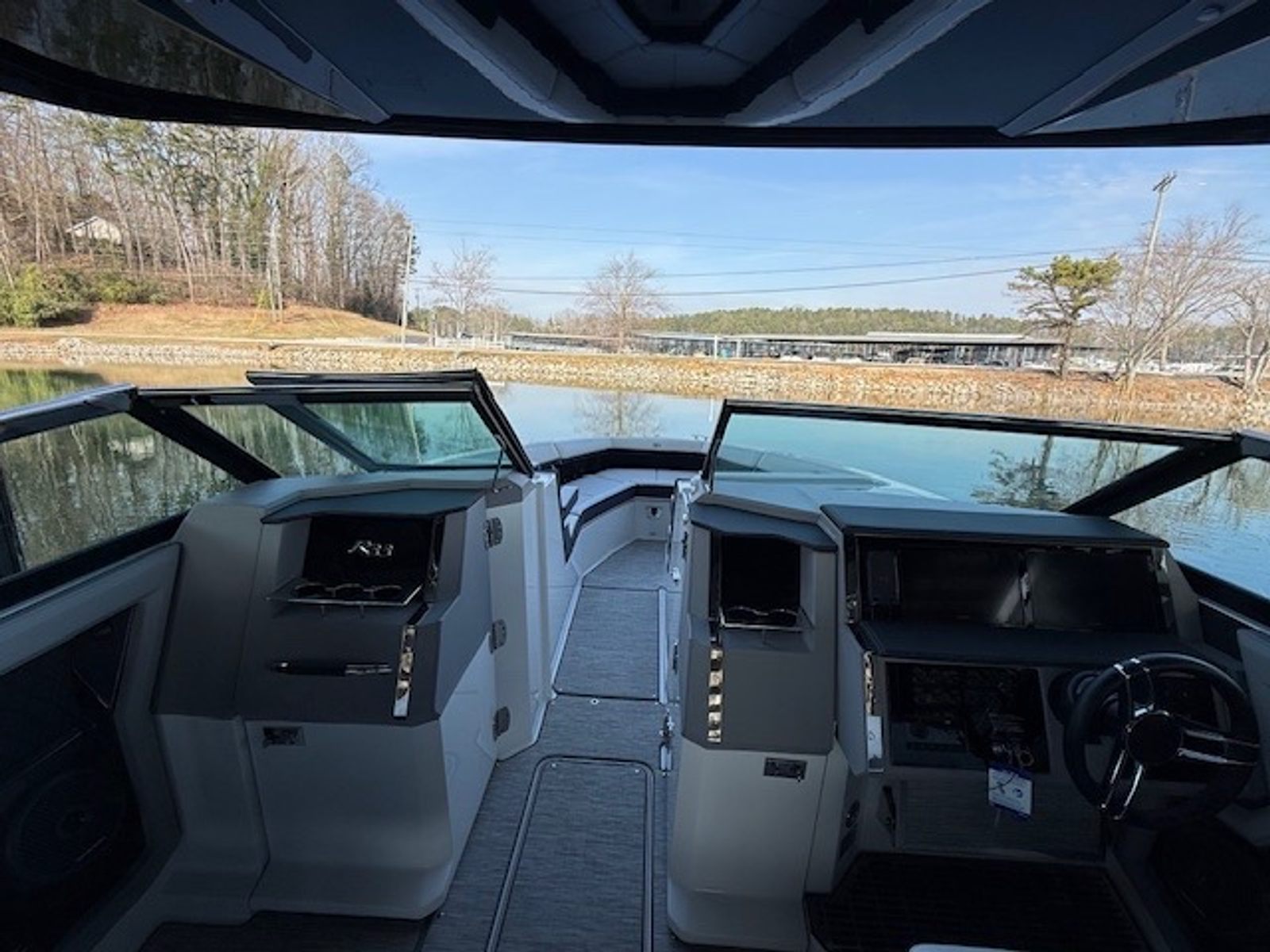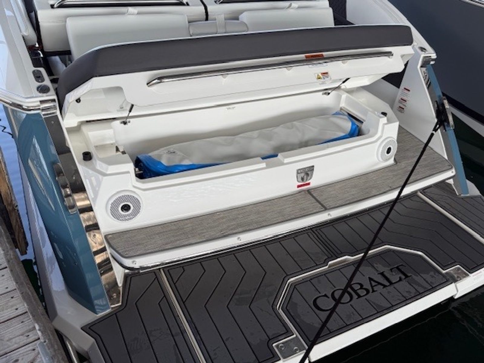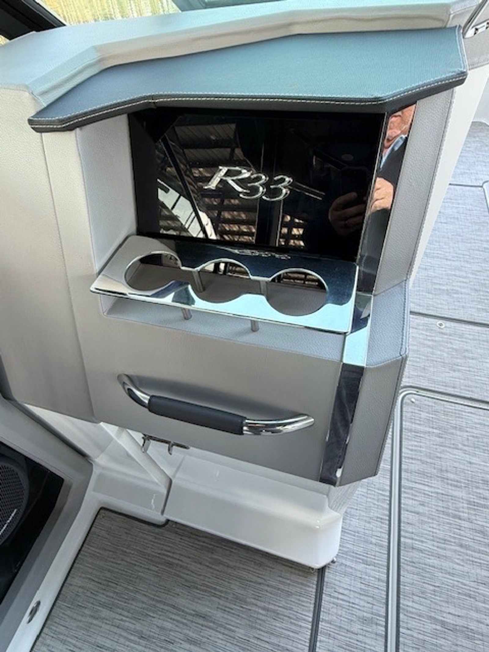 Below deck, the cabin adds versatility with sleeping accommodations, seating, a built-in smart TV, air conditioning, a VacuFlush head, and seagrass flooring. Finished in Summit interior with black leather, stainless accents, Cavern Grey cabin décor, and a striking Bayside Blue hull with Rich Ebony bottom, this R33 is both stylish and functional.