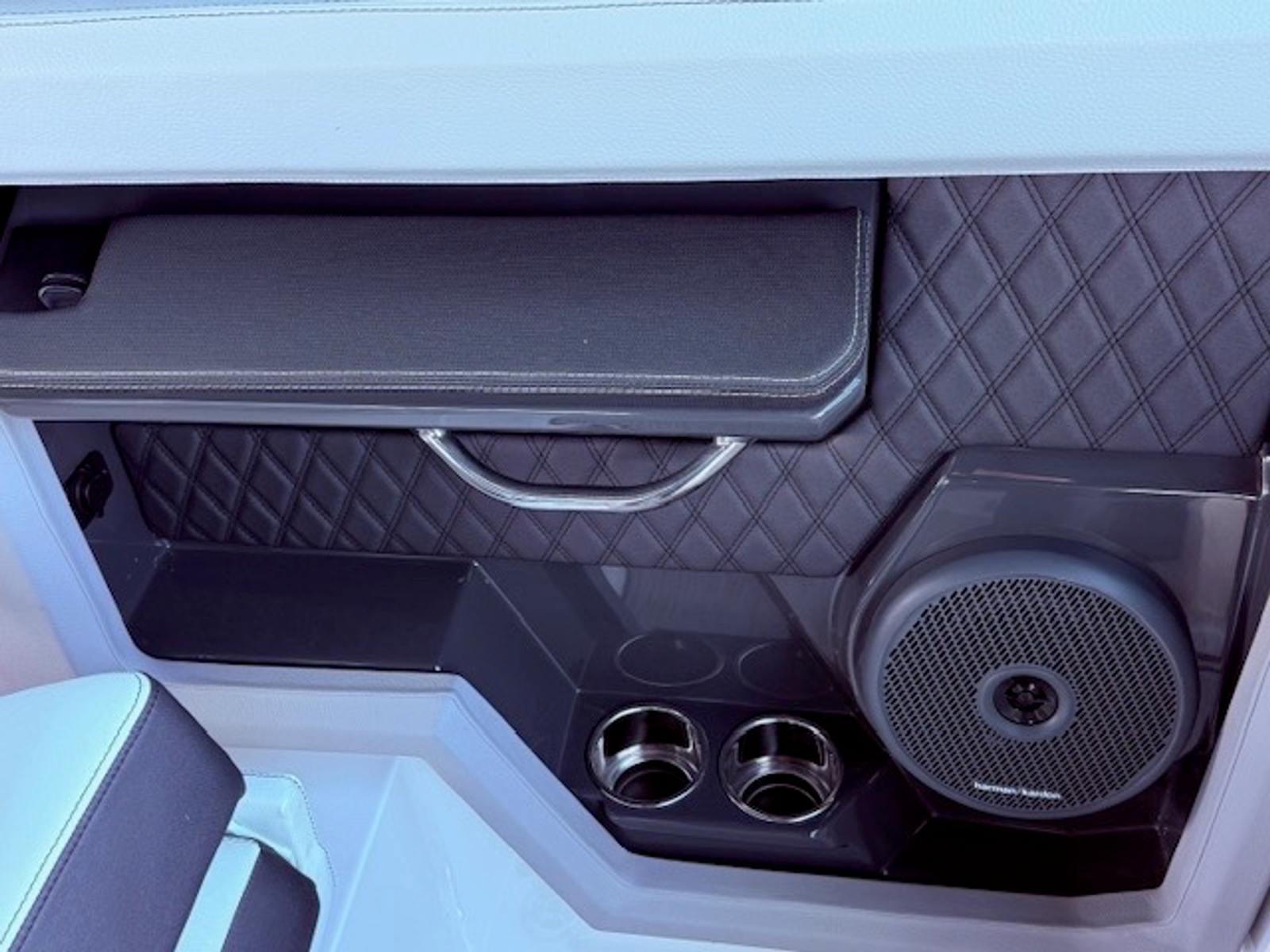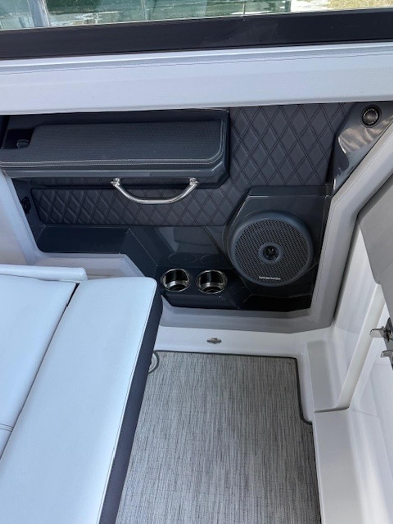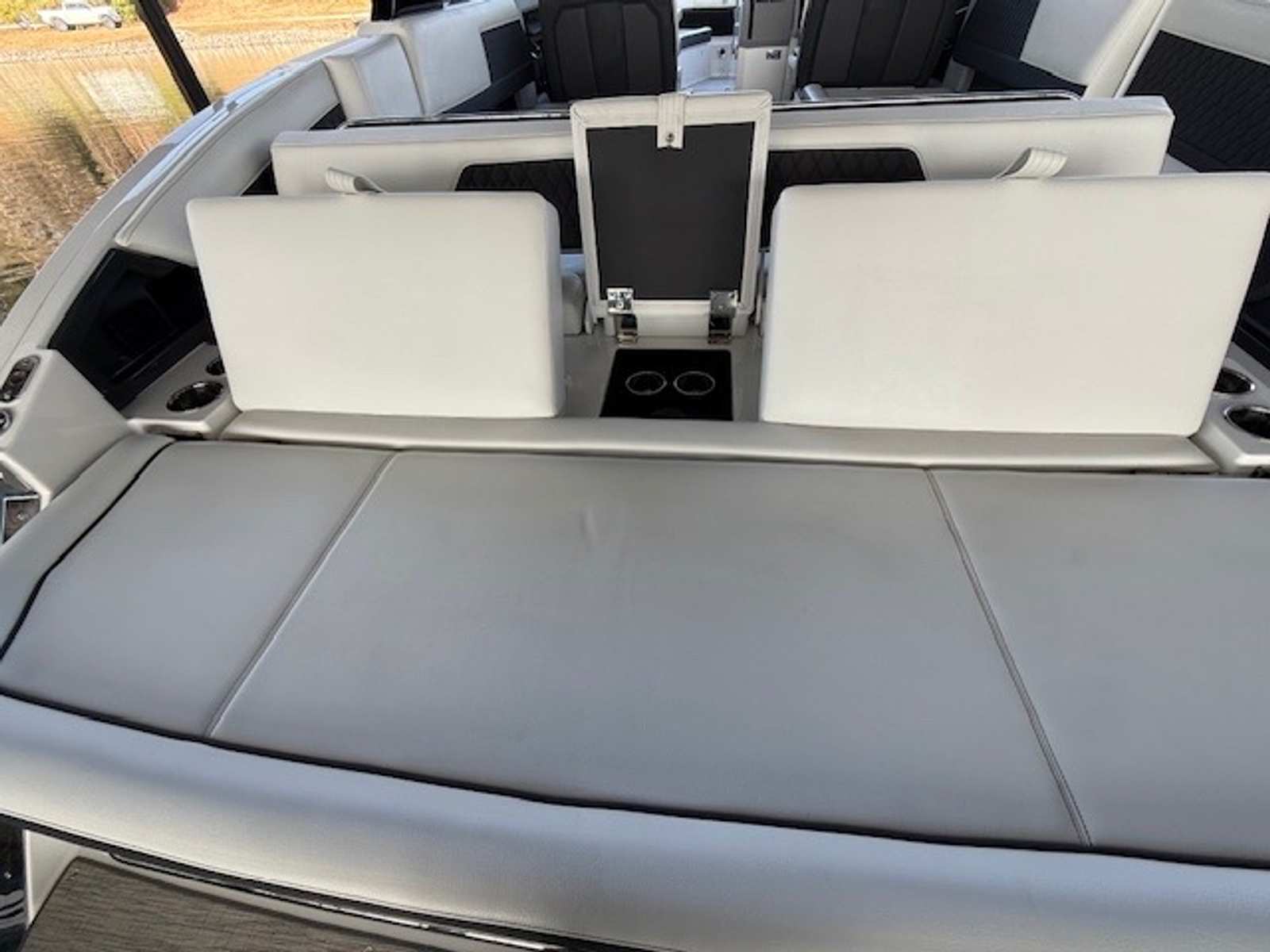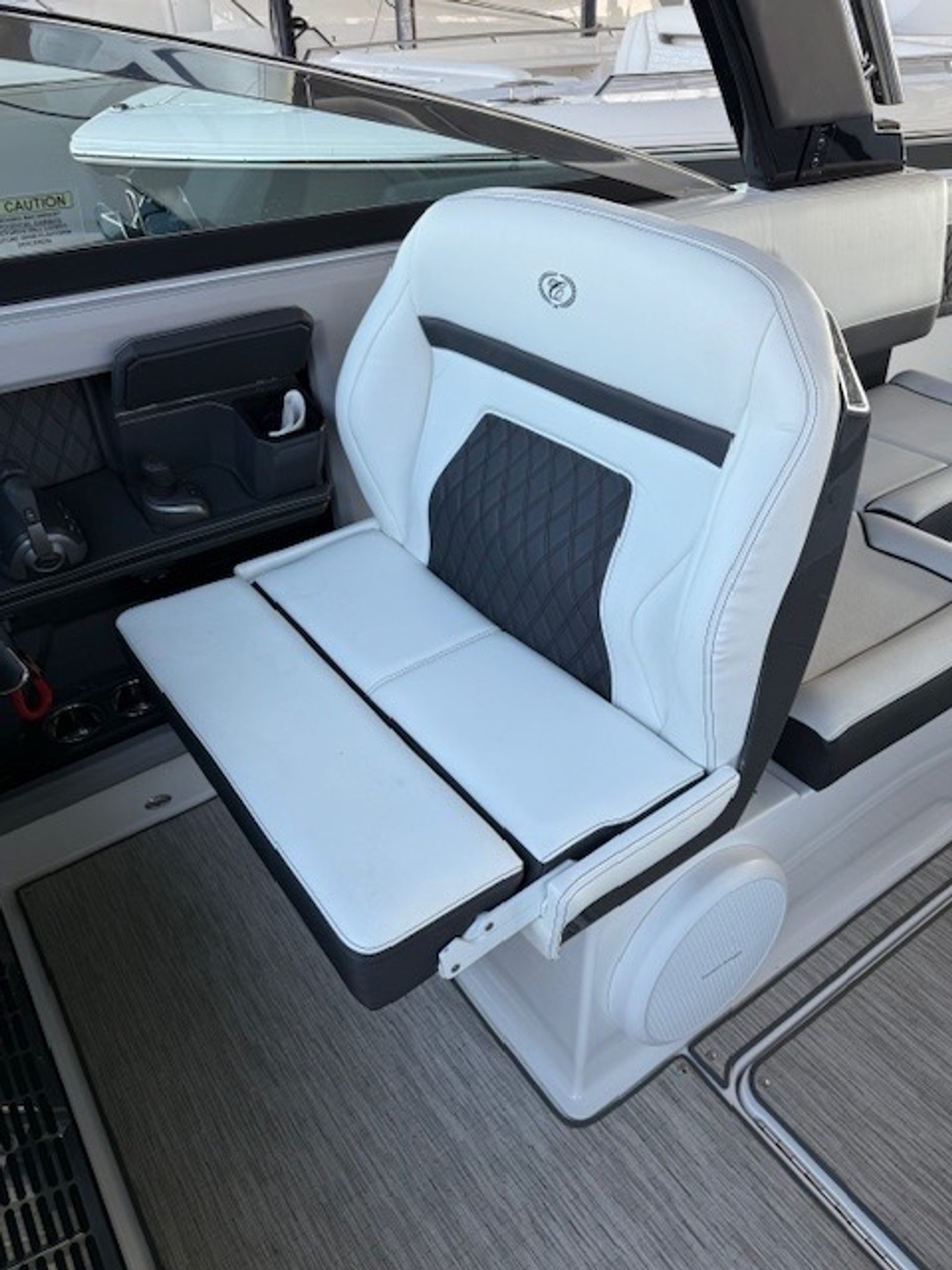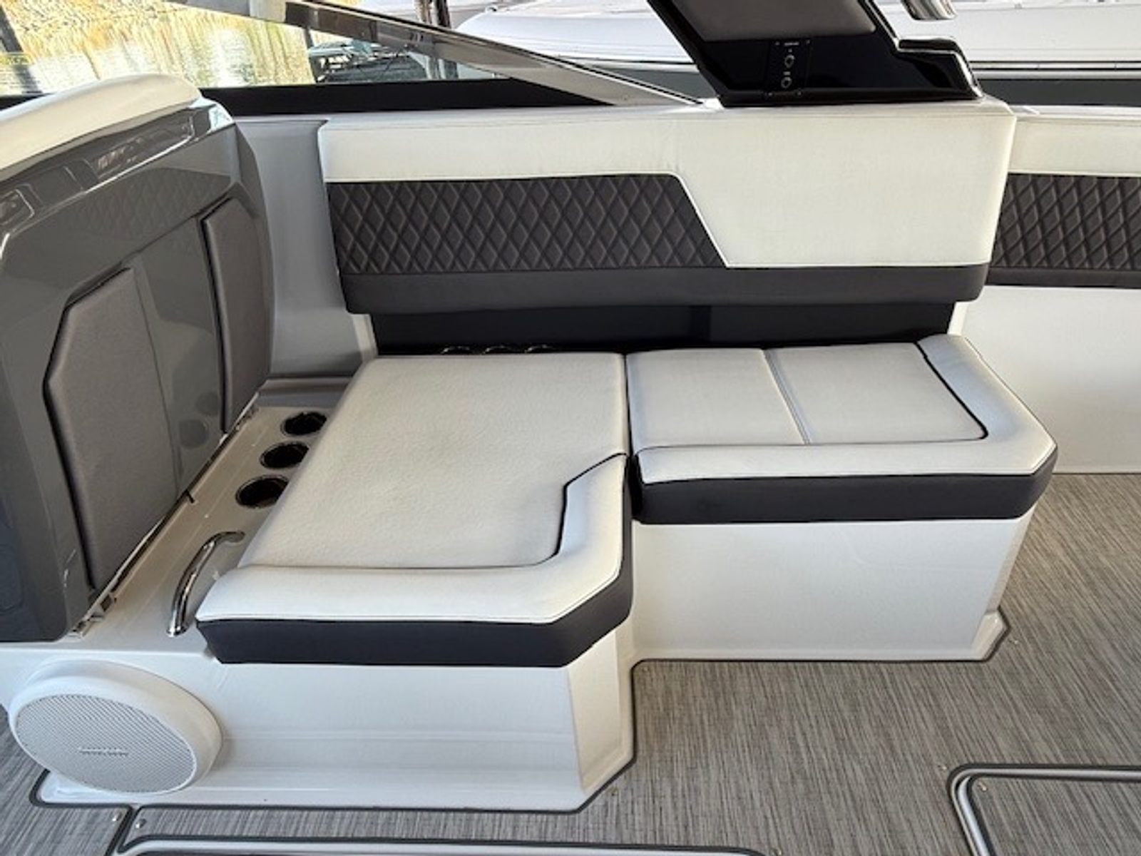 Comfort and amenities are front and center. The hydraulic swim platform with flip-down step creates effortless water access, while underwater RGB lighting and transom lighting set the tone at anchor. A Platinum Harman Kardon sound system with hardtop and transom speakers delivers impressive audio throughout the boat, and the wide, open seating layout makes it easy to host family and friends all day long.