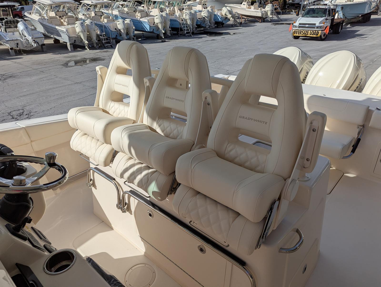 Power and precision are at the heart of the Grady-White Canyon 336. Outfitted with triple CW Yamaha F350 engines, this boat boasts a combined 1,050 horsepower, delivering exhilarating speed and agile handling for offshore adventures. The full maneuverability system ensures effortless docking, tight turns, and superior control in any sea condition. Whether you are chasing the horizon or navigating busy harbors, the Canyon 336’s performance pedigree guarantees a smooth, responsive ride every time you hit the water.