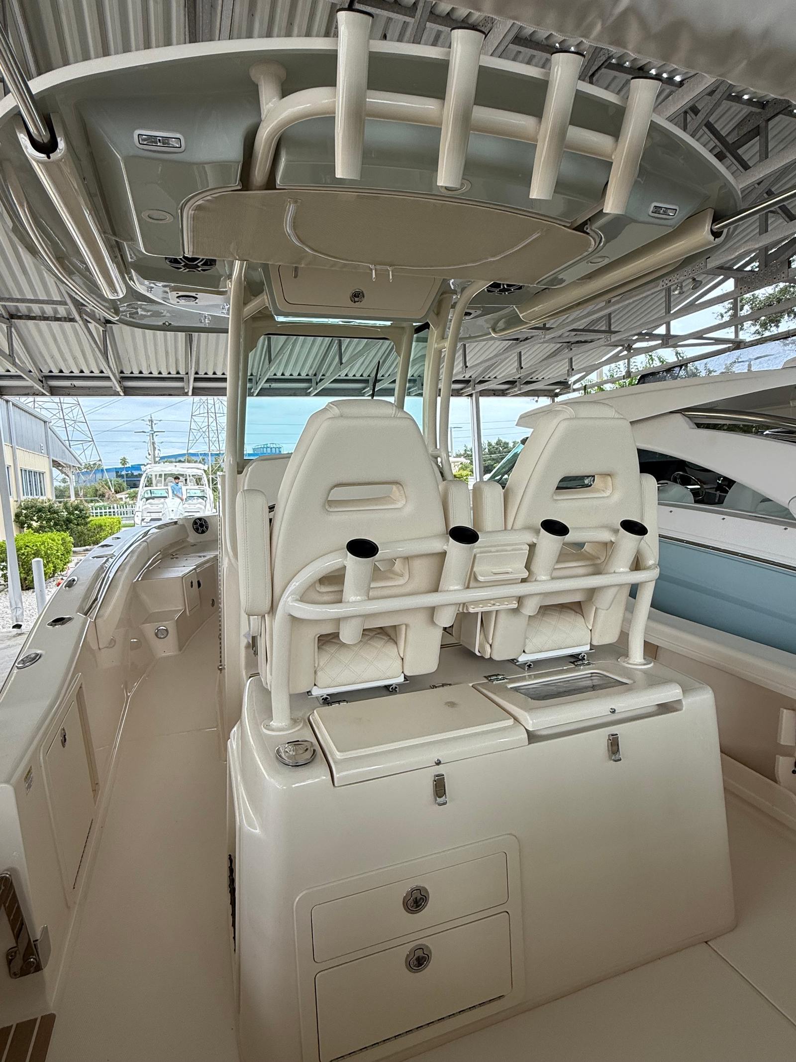 The Grady-White Coastal Explorer 281 is as practical as it is luxurious. Its center console design offers excellent visibility and maneuverability, making docking and navigating tight spaces a breeze. The trolling motor prep package allows for easy customization, catering to serious anglers who want to optimize their fishing experience. The ample deck space and smart storage solutions ensure that all your gear, supplies, and personal items are easily accessible and securely stowed. The shade options, including the ivory bow shade and Power PTX Sure Shade Top Oyster, provide essential protection from the elements, allowing you to stay comfortable during long days on the water. The boat’s efficient design and powerful engines contribute to fuel efficiency, reducing the frequency of refueling stops and maximizing your time on the water.