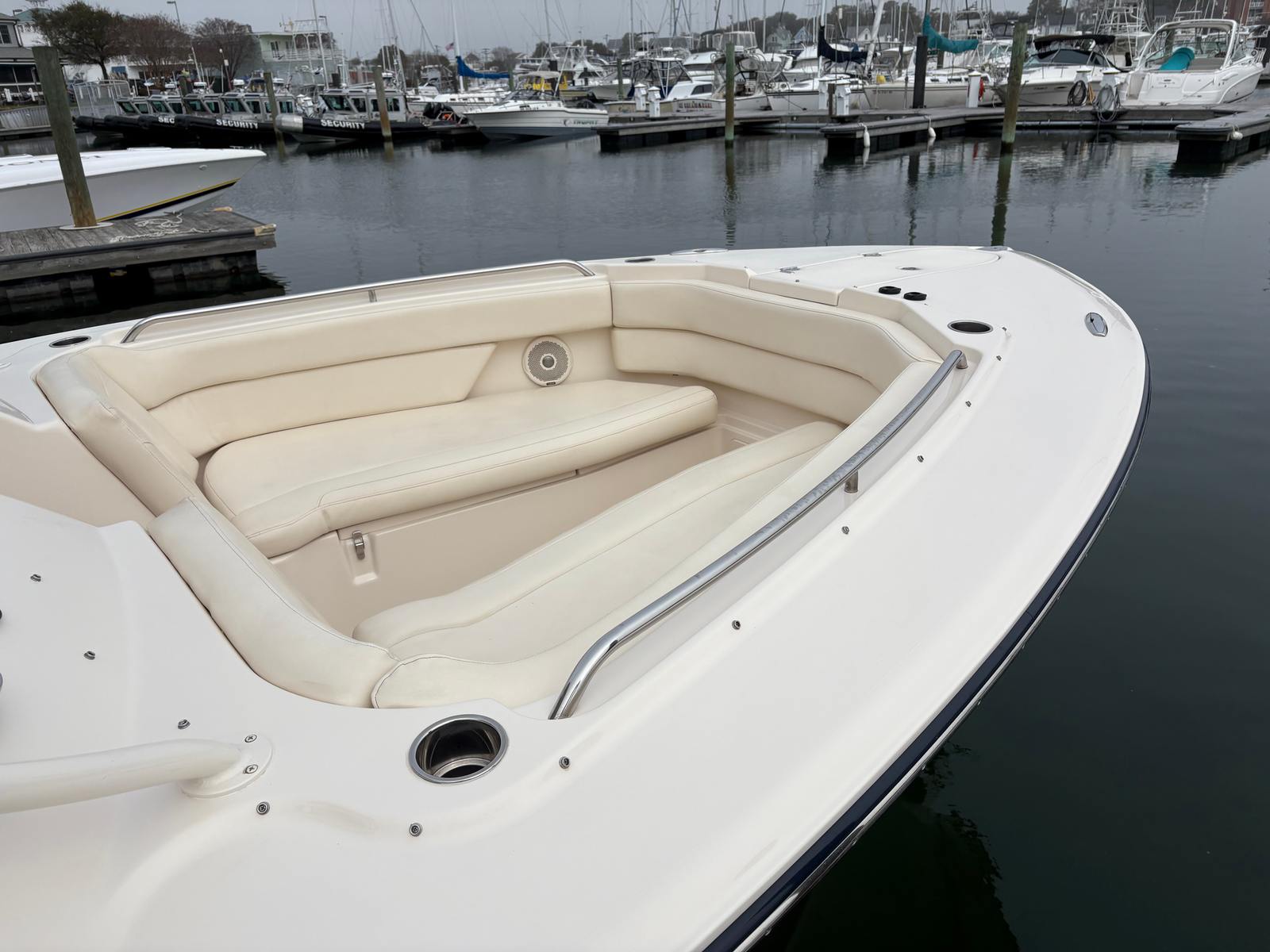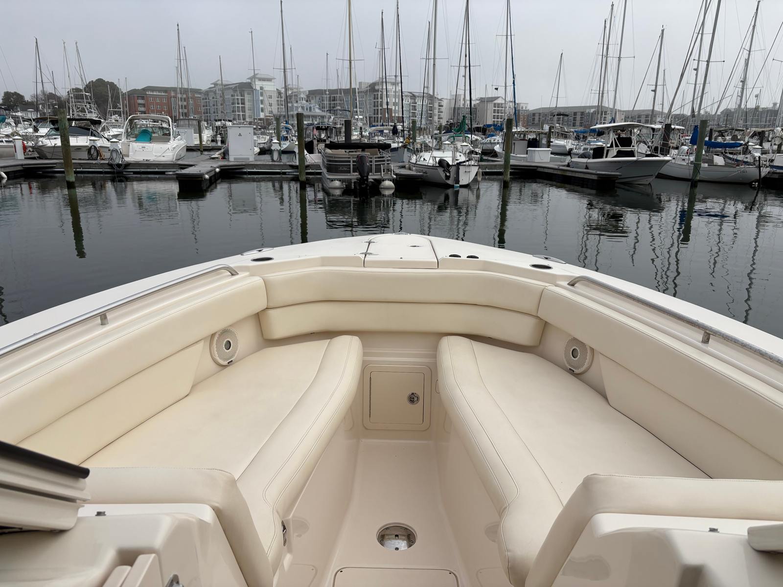 Powered by twin engines delivering a combined 600 horsepower, the Grady-White Freedom 307 offers exhilarating performance and smooth handling. The dual engines provide impressive acceleration, responsive maneuverability, and the confidence to tackle a variety of water conditions. Whether you are cruising along the coastline, heading offshore for a day of fishing, or enjoying water sports with family and friends, this Dual Console boat for sale delivers the power and reliability you need. The robust engine setup ensures that you can reach your favorite destinations quickly and efficiently, making every outing more enjoyable.