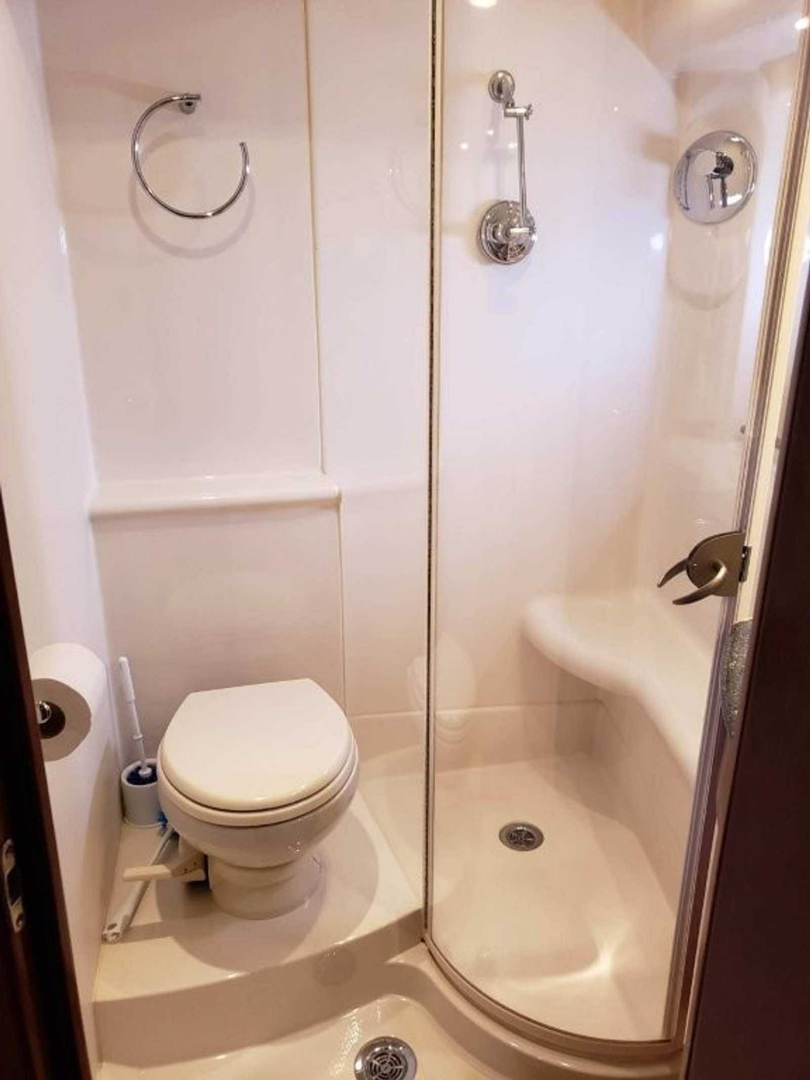The 441’s expansive layout offers an inviting atmosphere, highlighted by Meridian’s signature two-tier window system that floods the salon, dinette, and galley with natural light. The open floor plan enhances visibility and flow between living spaces, making entertaining and extended cruising effortless. Below deck, a two-stateroom, two-head configuration ensures comfort for family and guests alike. The forward master suite features a queen island berth with innerspring pillowtop mattress, while the full-beam amidship guest stateroom offers a double berth, vanity, settee, and ample storage.