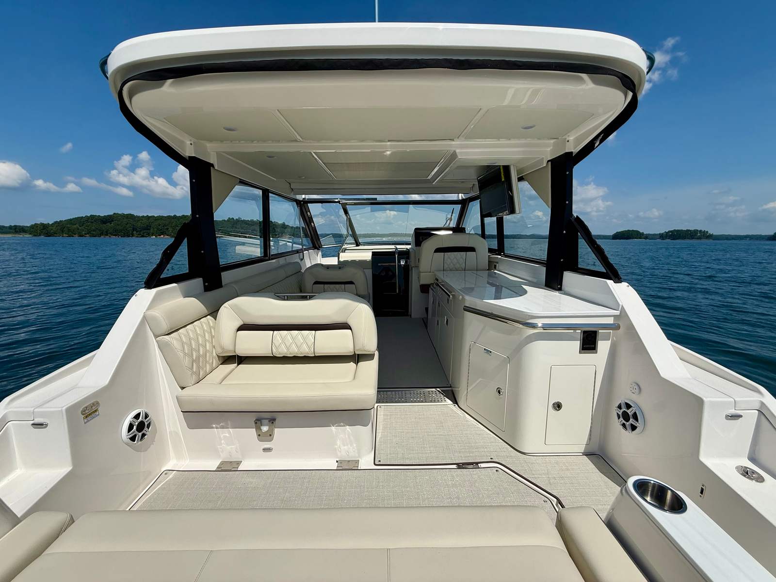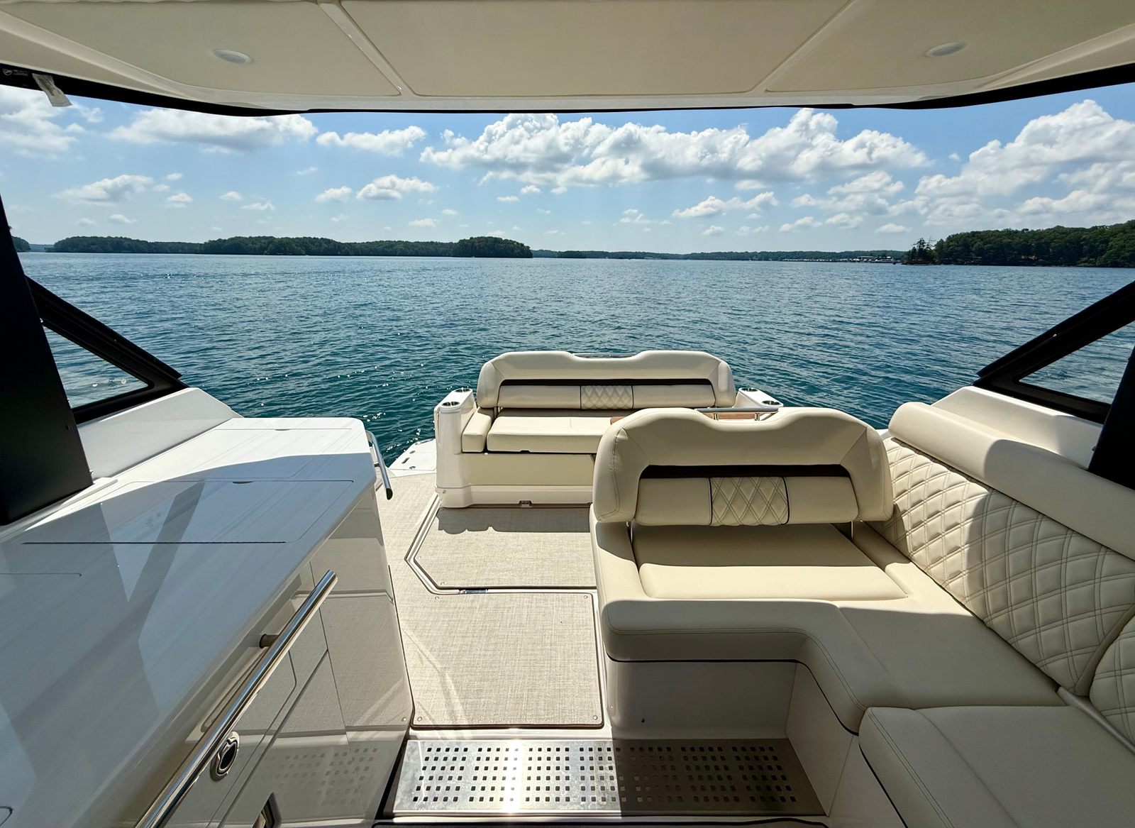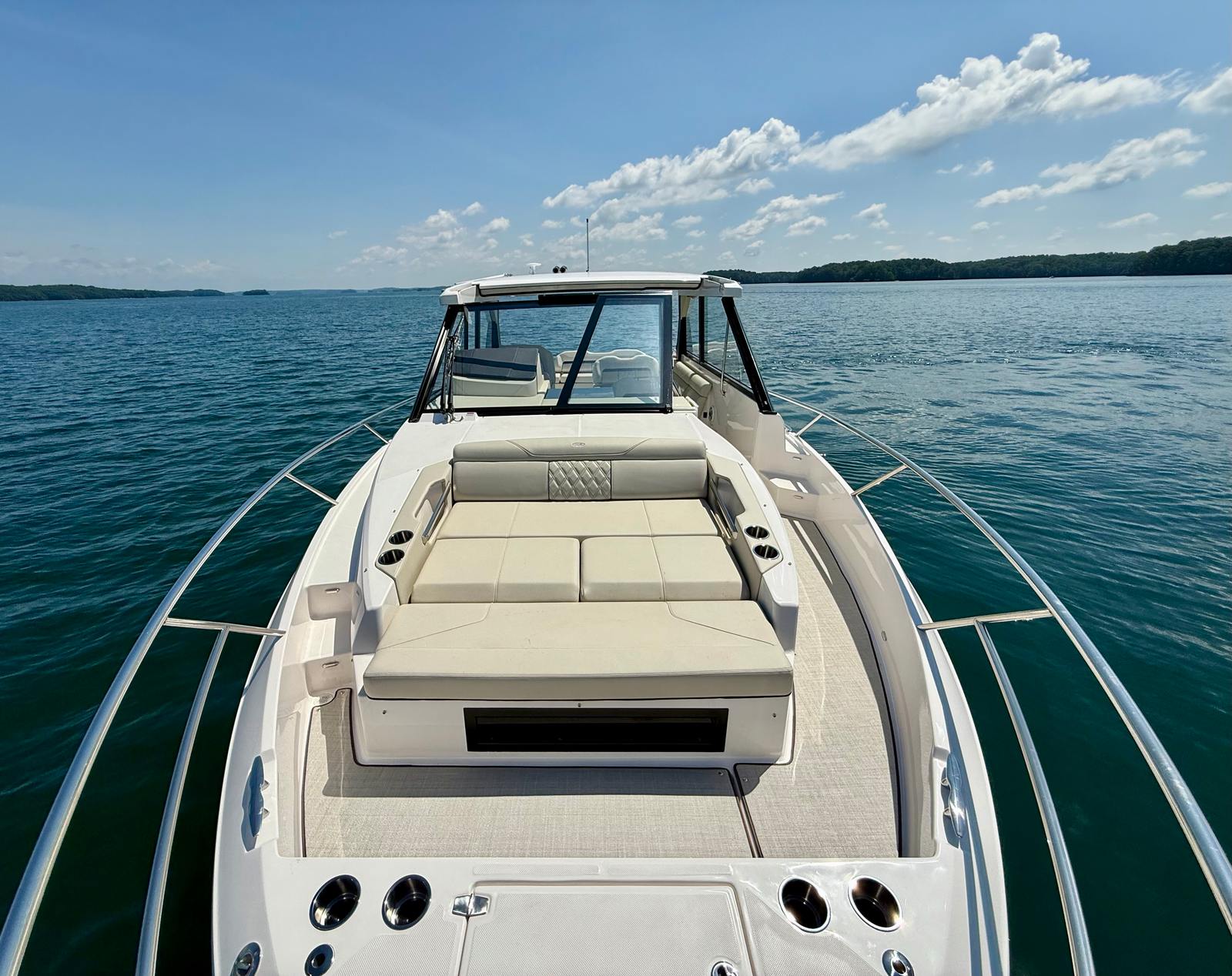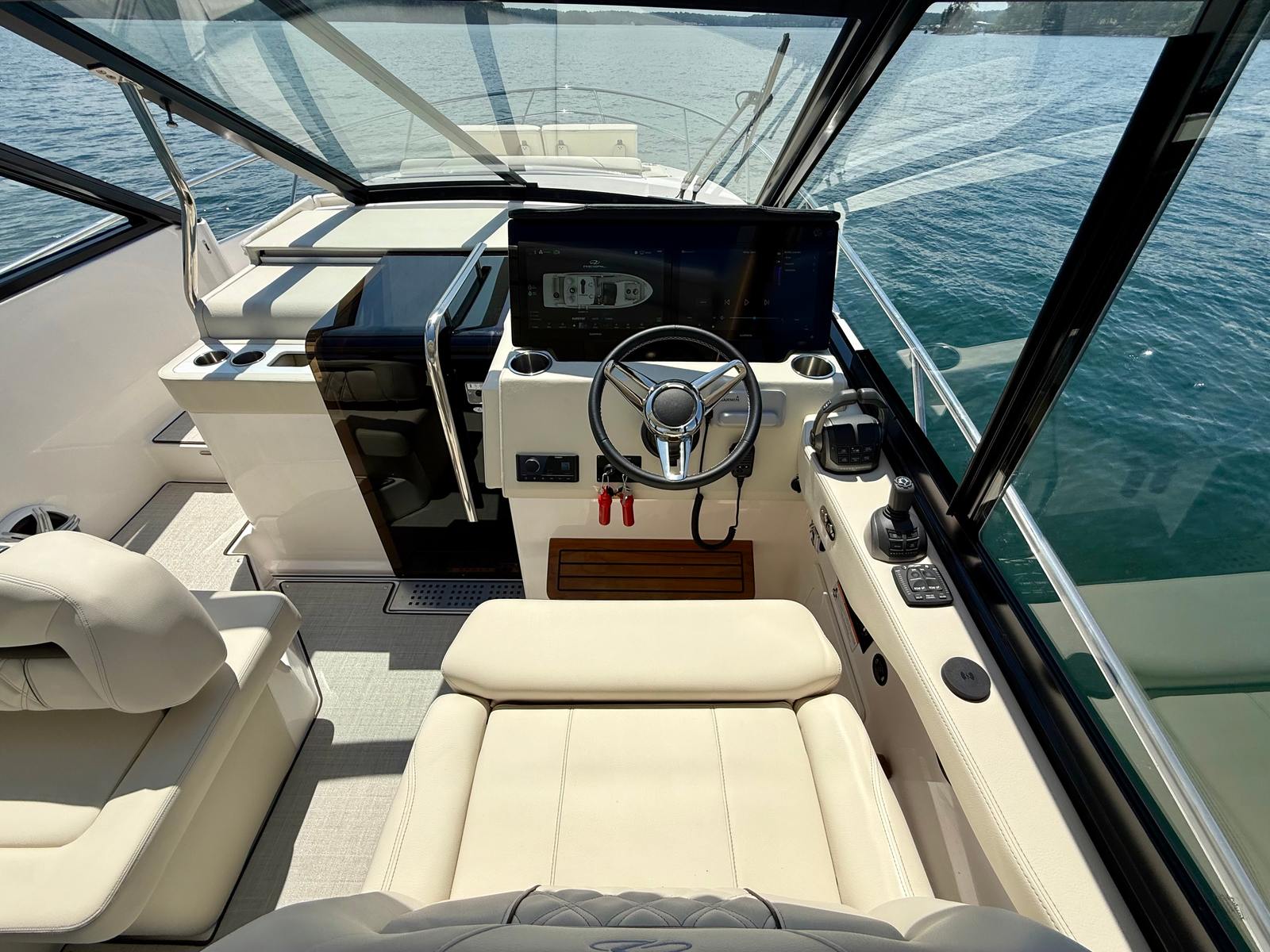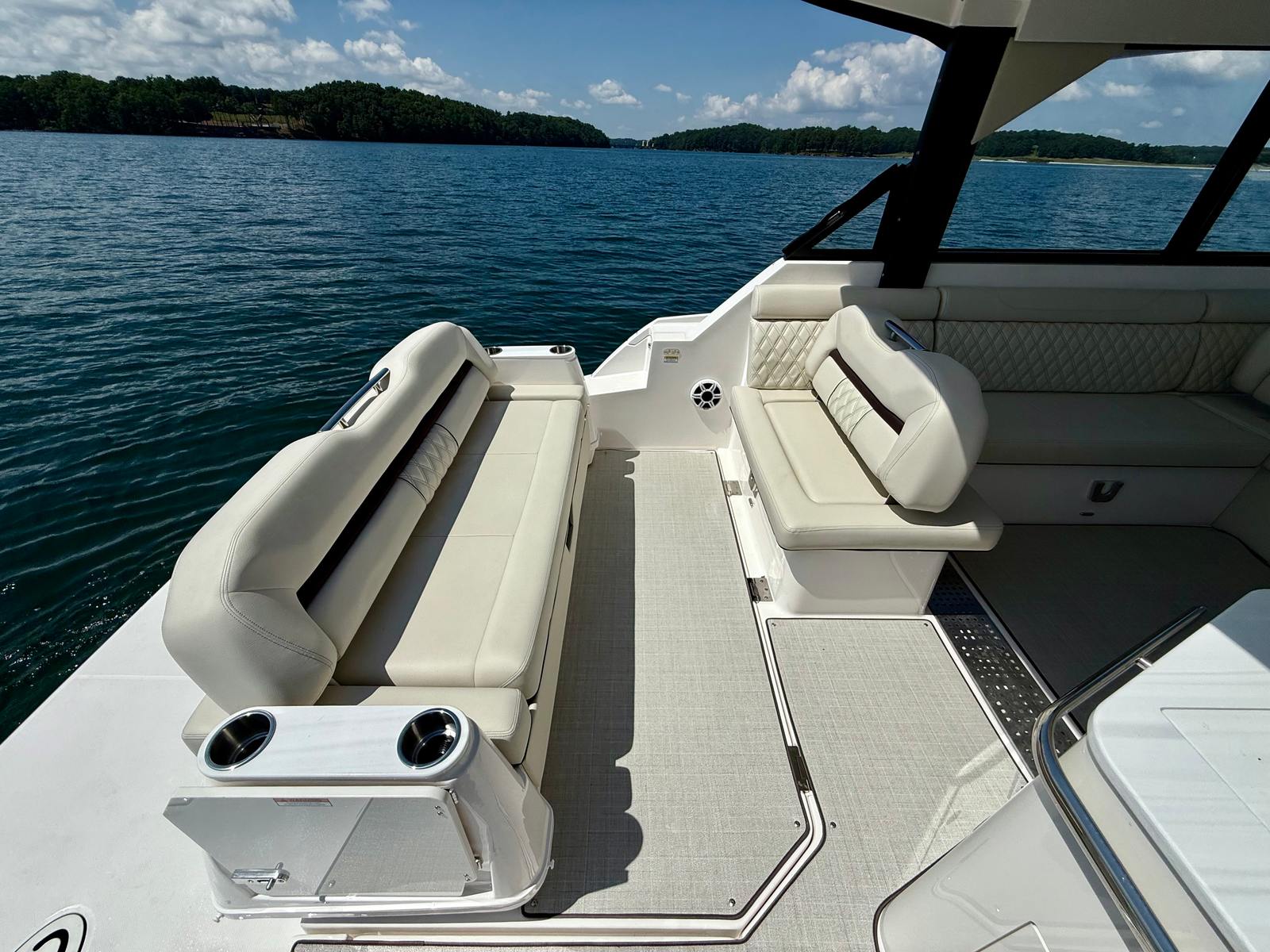 Powered by twin Volvo V8 350 EVC2 DP CAT engines delivering 700 horsepower, the 36 Grande Coupe combines strong performance with smooth handling. Joystick control makes docking simple, whether in tight quarters or busy marinas. This boat is designed to give you confidence on the water, whether you’re running wide open or enjoying a quiet cruise.