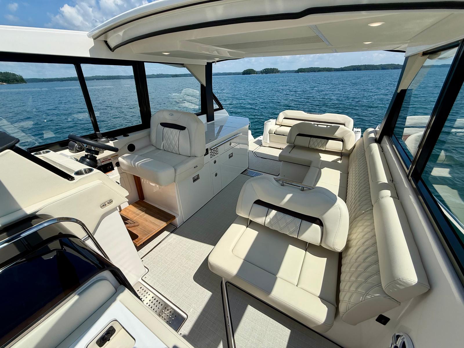 The layout is designed for all-weather use, with a full cockpit IsinGlass enclosure, Makrolon salon enclosure, and a manual bow sunshade for warm days. Inside, Regal’s attention to detail comes through with Toasted Oak flooring, Strato Wind countertops, and a light, neutral interior that feels open and inviting.