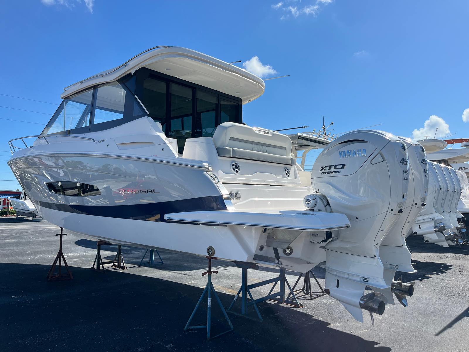The Regal 36 XO is as practical as it is luxurious. Its generous length provides ample storage for gear, water toys, and provisions, making it ideal for extended outings or spontaneous getaways. Docking is made easier by the yacht’s agile handling and responsive controls, allowing you to navigate marinas and tight spaces with confidence. The efficient twin Yamaha engines offer excellent fuel economy for a vessel of this size, helping you maximize your time on the water without frequent refueling stops. The Palm Beach Enclosure and other protective features ensure comfort in a variety of weather conditions, so you can enjoy your yacht year-round.