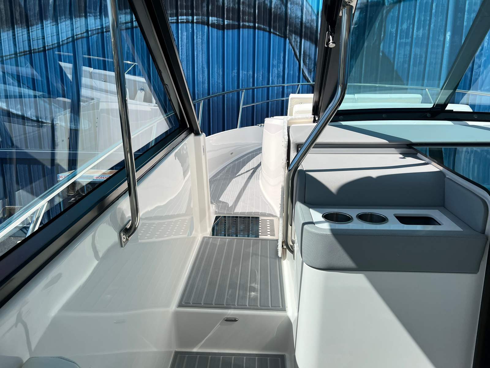 The 2026 Regal 36 XO is loaded with features designed to enhance your time on the water. The yacht’s exterior is a visual masterpiece, featuring a graphite hull, Belle Isle Blue bootstripe, and graphite bottom color that ensure you turn heads wherever you go. The Titanium interior offers a modern, luxurious environment, perfect for relaxing or entertaining guests. For those sunny days, the manual bow sunshade system provides welcome relief, allowing you to enjoy the outdoors in comfort. The Makrolon salon enclosure offers protection from the elements while maintaining clear views and an open feel. Transom seat covers in black canvas add a touch of elegance and help protect your seating when not in use. Notably, this yacht comes with no bottom paint, preserving the clean, sleek look of the hull.