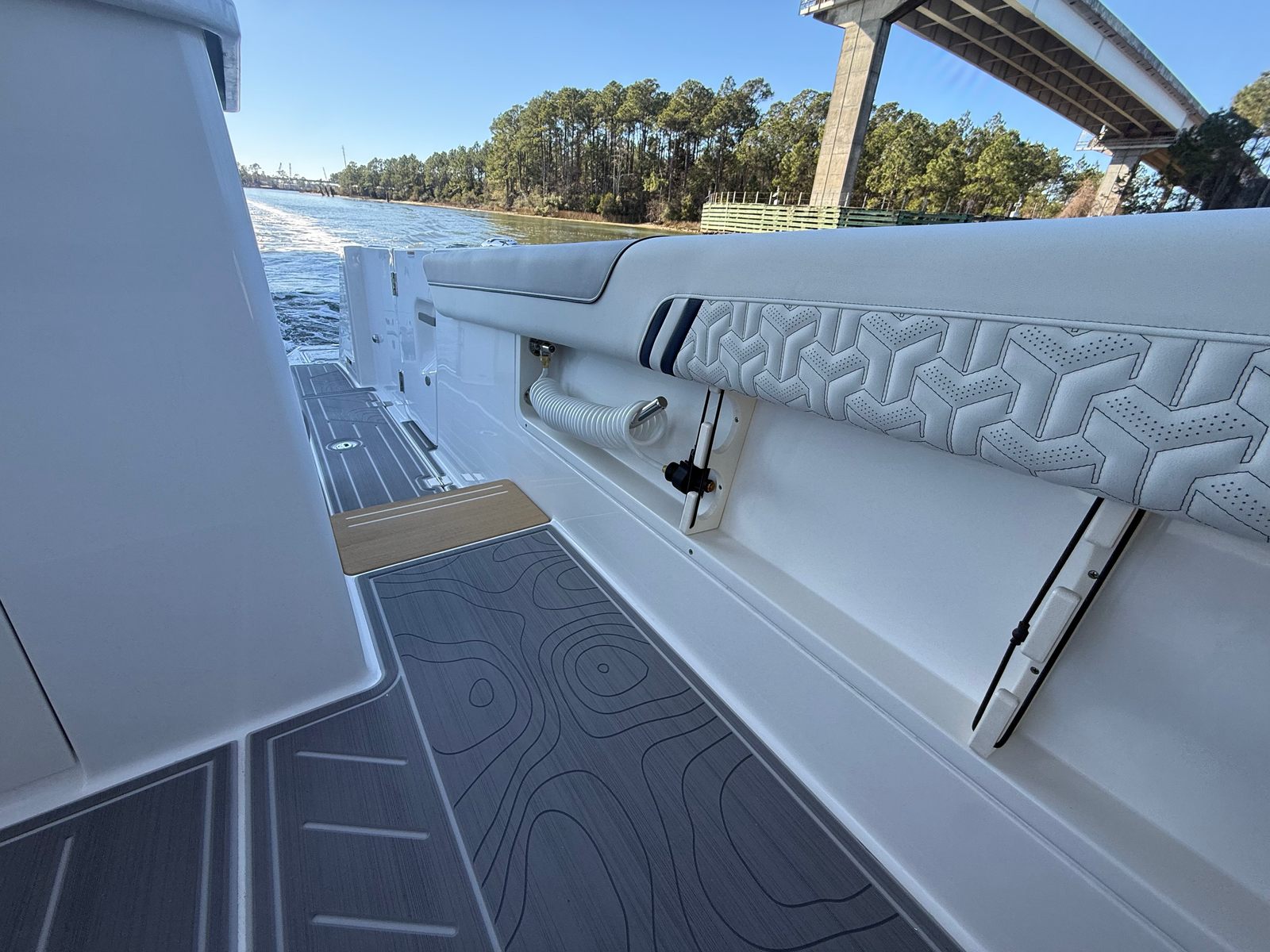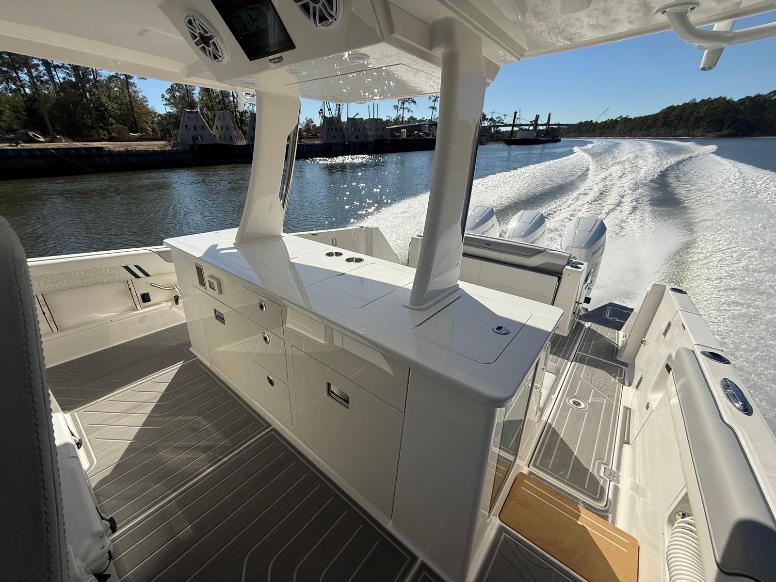 The 2026 Regal 38 SAV is loaded with special features that set it apart from other yacht boats for sale. The triple Mercury 425 Verado engines provide unmatched power and agility, ensuring that you can reach your favorite destinations quickly and comfortably. The hull’s Tahiti Beach White finish, complemented by the Mediterranean Blue bootstripe and hull bottom, creates a striking visual impression that is both elegant and modern. The yacht’s multi-zone color scheme—Zone 1 in Pure White, Zones 2, 3, and 4 in Lunar Gray, and Zones 5 and 6 in Mediterranean Blue—adds depth and sophistication to its overall design. Every detail of this yacht has been carefully considered to enhance both its appearance and its functionality.