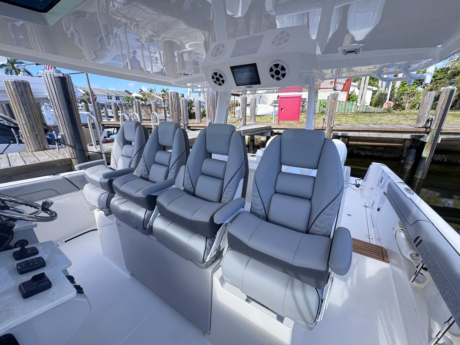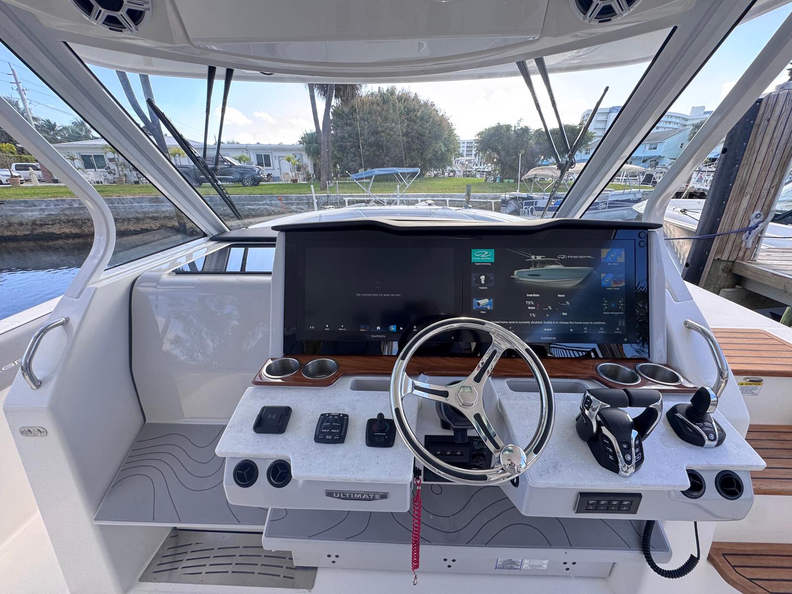 The Regal 38 SAV is as practical as it is luxurious. The ample storage options throughout the yacht make it easy to stow gear, water toys, and personal items, keeping the deck clutter-free and organized. The integrated steering system simplifies docking and close-quarters navigation, reducing stress and allowing you to focus on enjoying your time on the water. The efficient design of the triple Yamaha engines ensures optimal fuel usage, so you can spend more time cruising and less time refueling.The durable teak steps provide secure footing when boarding or moving about the yacht, while the protective canvas covers help maintain the vessel’s pristine appearance. Every feature is designed with the owner’s convenience in mind, making the 38 SAV a smart choice for those seeking a yacht boat for sale that balances luxury with everyday usability.