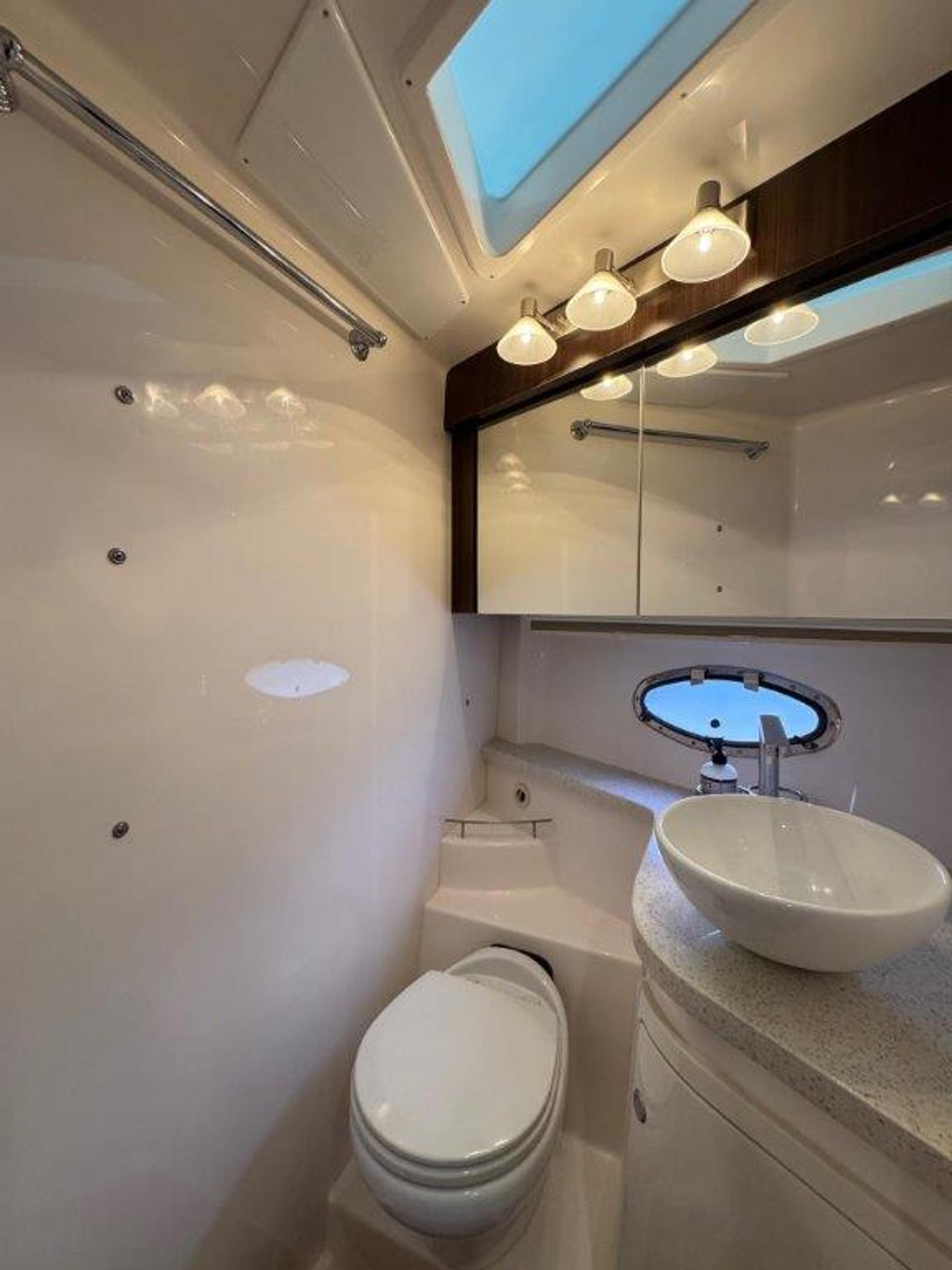 Mid-cabin: twin berths with sectional filler, ensuite electric head with vanity and sink