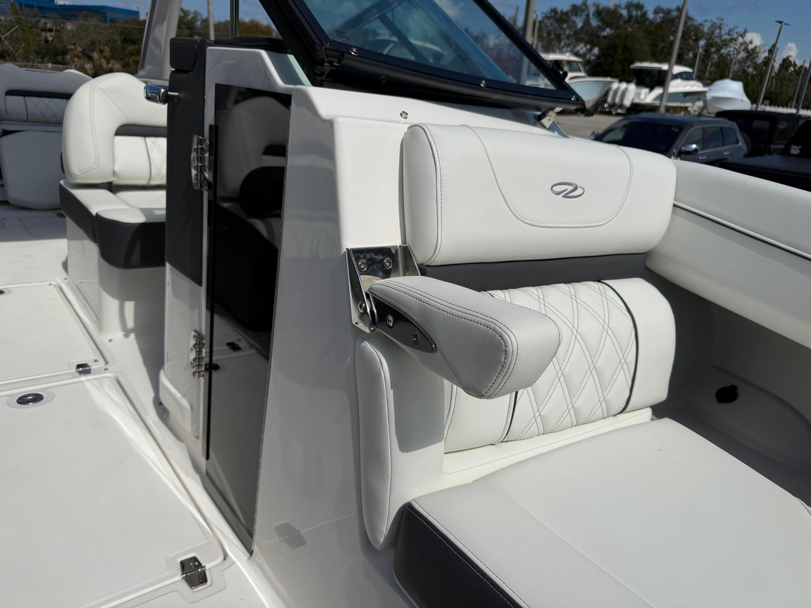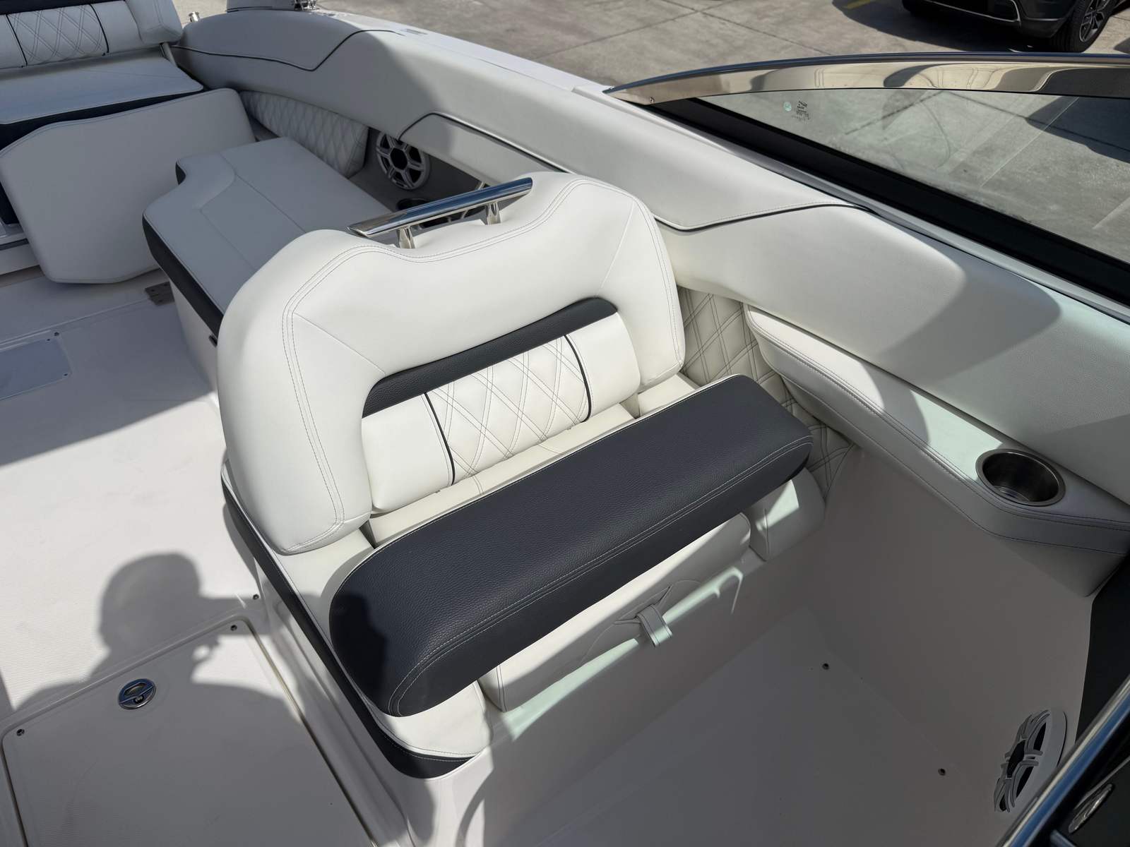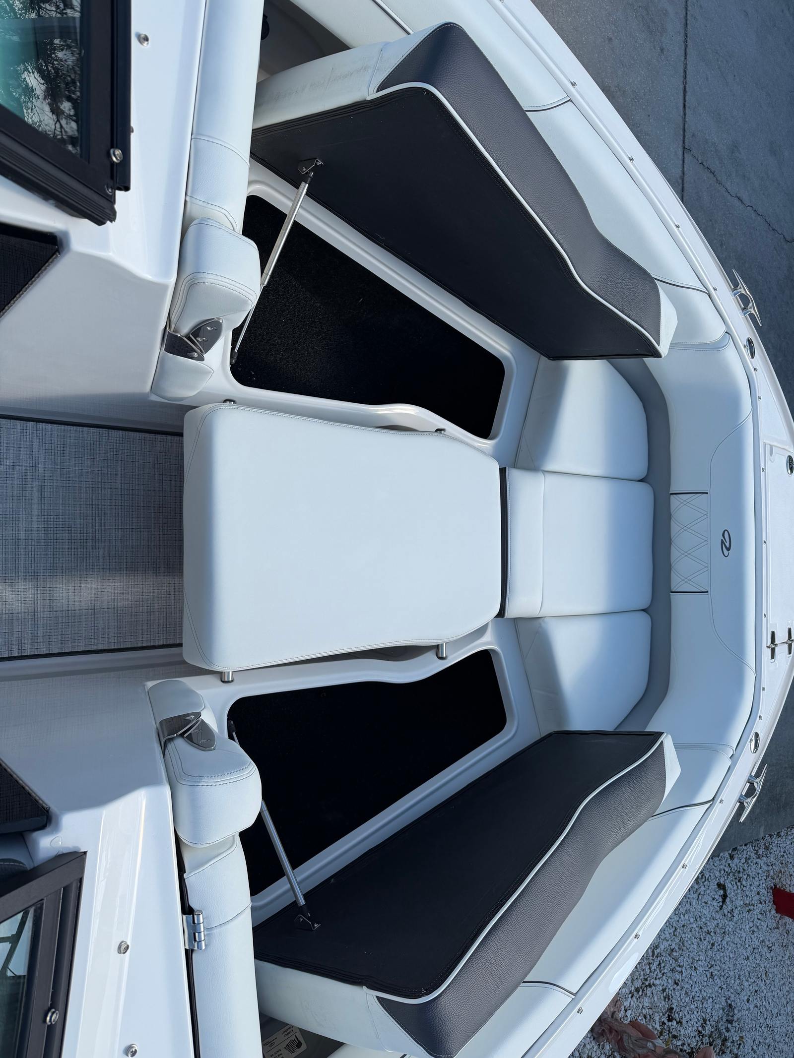 The 2026 Regal LX6 Bowrider is equipped with a range of special features designed to enhance your time on the water. The Titanium interior provides a sophisticated and comfortable environment, while the Bow & Cockpit Covers and Steel Grey canvas offer protection from the elements and keep your boat looking pristine. The Cockpit Seagrass Mat adds a touch of elegance and comfort underfoot, making every moment onboard enjoyable. The dual battery switch with tray and cables, along with the battery charger, ensures reliable power management for all your onboard electronics and accessories.The thoughtful color palette, including the Steel Grey hull, Mediterranean Blue bootstripe, and Tahiti Beach White bottom, gives the LX6 a distinctive and modern look that stands out at the marina or on open water. Every detail is crafted to provide both aesthetic appeal and functional benefits, making this Bowrider boat for sale a true head-turner.