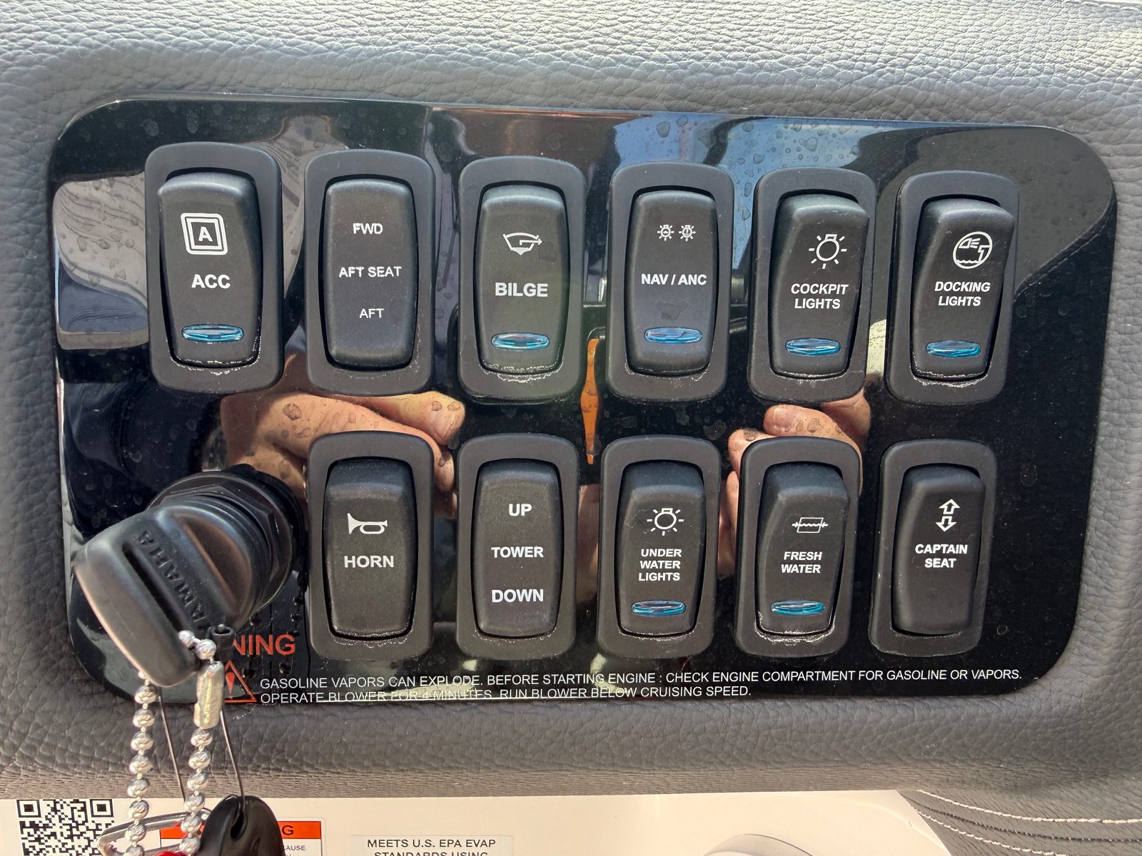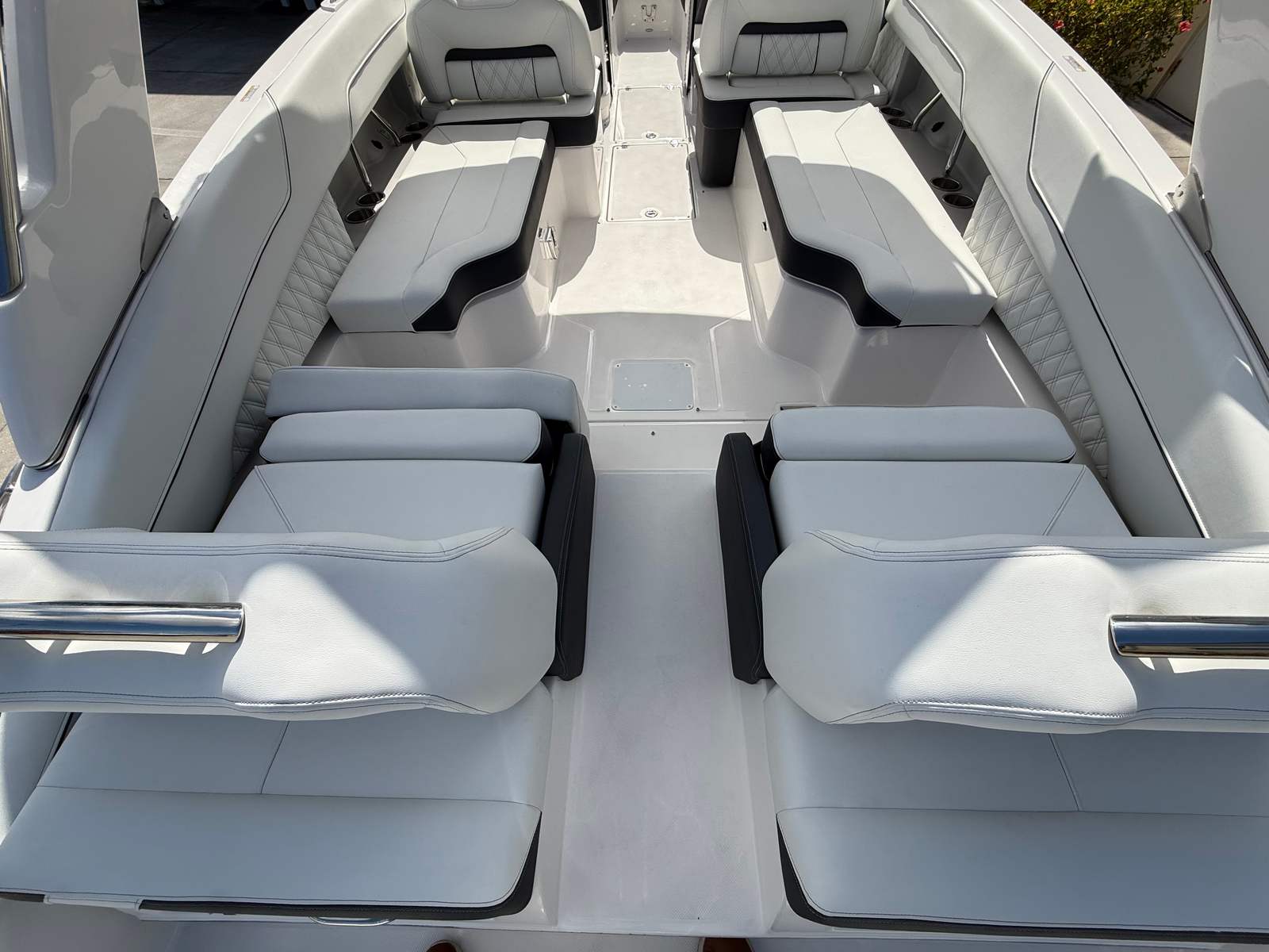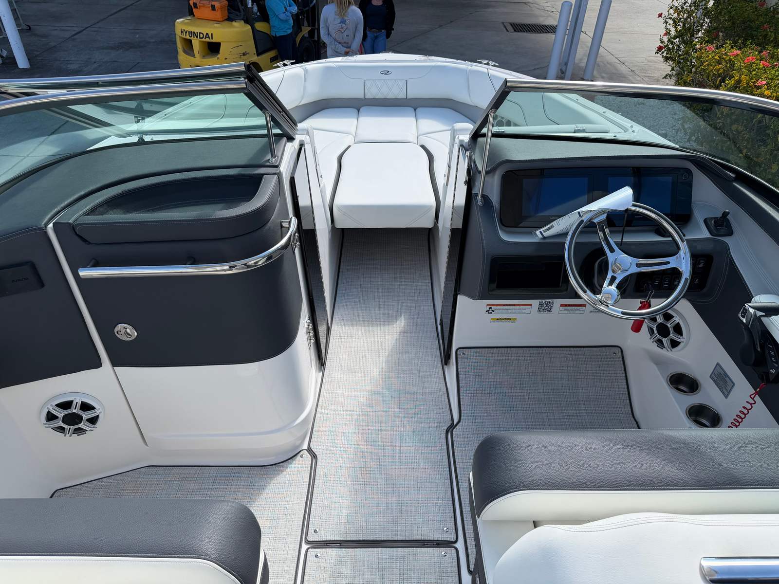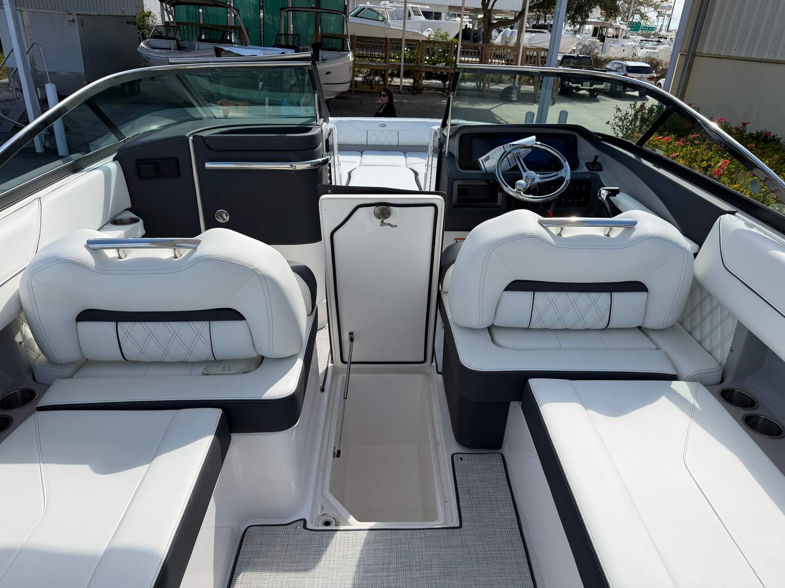 The 2026 Regal LX6 Bowrider is equipped with a range of special features designed to enhance your time on the water. The Titanium interior provides a sophisticated and comfortable environment, while the Bow & Cockpit Covers and Steel Grey canvas offer protection from the elements and keep your boat looking pristine. The Cockpit Seagrass Mat adds a touch of elegance and comfort underfoot, making every moment onboard enjoyable. The dual battery switch with tray and cables, along with the battery charger, ensures reliable power management for all your onboard electronics and accessories.The thoughtful color palette, including the Steel Grey hull, Mediterranean Blue bootstripe, and Tahiti Beach White bottom, gives the LX6 a distinctive and modern look that stands out at the marina or on open water. Every detail is crafted to provide both aesthetic appeal and functional benefits, making this Bowrider boat for sale a true head-turner.