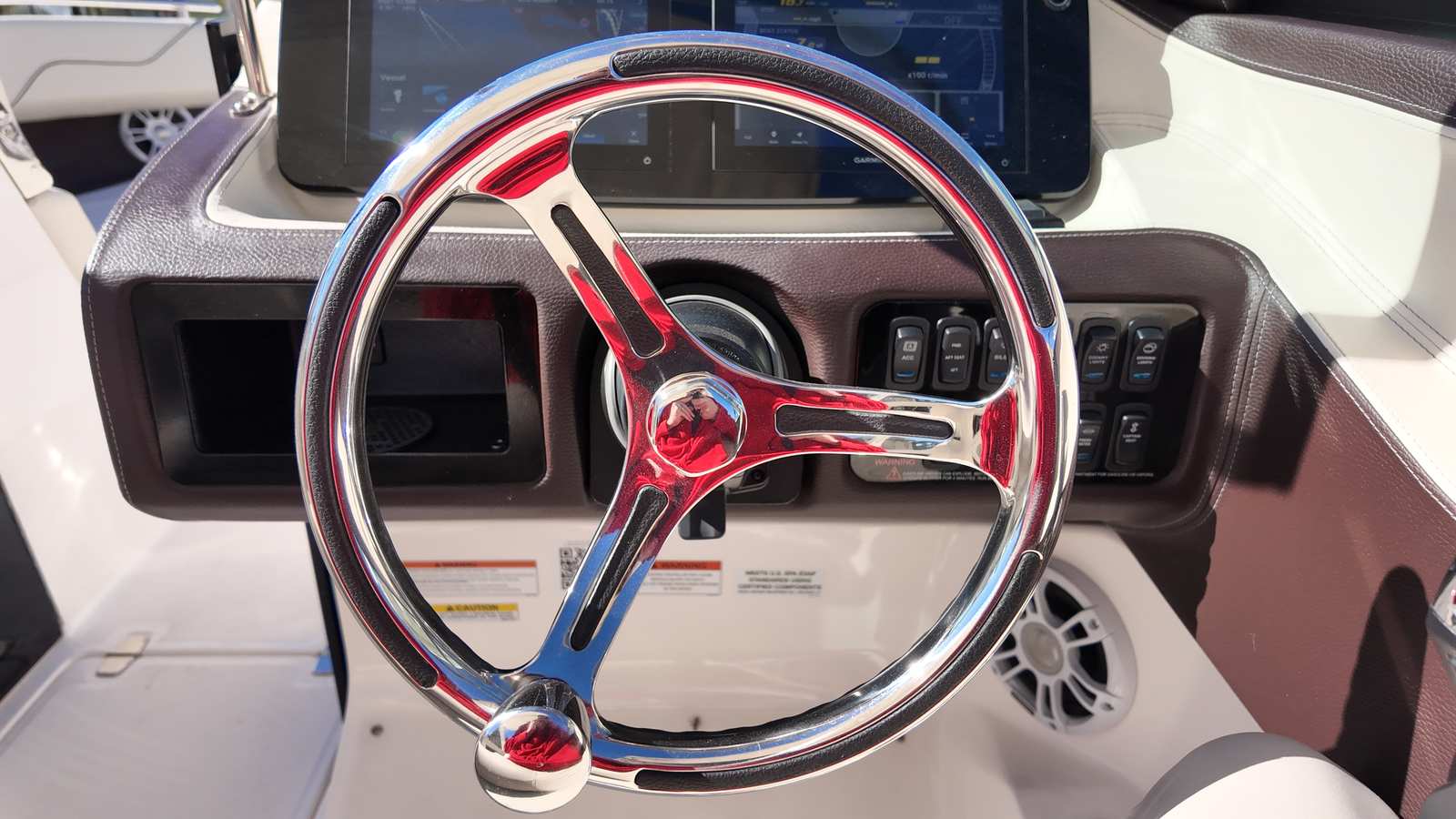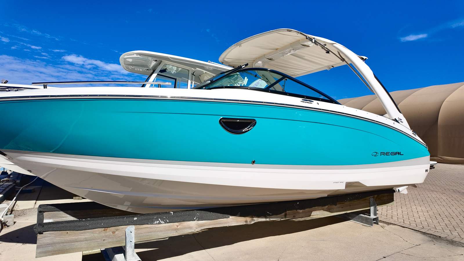 The Regal LX6 Bowrider is loaded with premium features designed to elevate your boating experience. The cockpit table crafted from teak offers a sophisticated space for dining, socializing, or simply relaxing with a drink in hand. Fender clips provide convenient and secure attachment points for fenders, making docking and mooring hassle-free. The stainless steel flag pole, complete with a U.S. flag, adds a touch of patriotism and elegance to your vessel.Navigation and entertainment are taken to the next level with dual Garmin 943XS displays and a B60 transducer, ensuring accurate chart plotting, fish finding, and system monitoring. The Stereo Performance & Lighting Package delivers immersive sound and vibrant lighting, setting the perfect mood for any occasion. The hull’s striking Bimini Blue color, paired with the Tahiti Beach White bottom and Steel Grey bootstripe, creates a visually stunning aesthetic that reflects Regal’s commitment to style and quality.