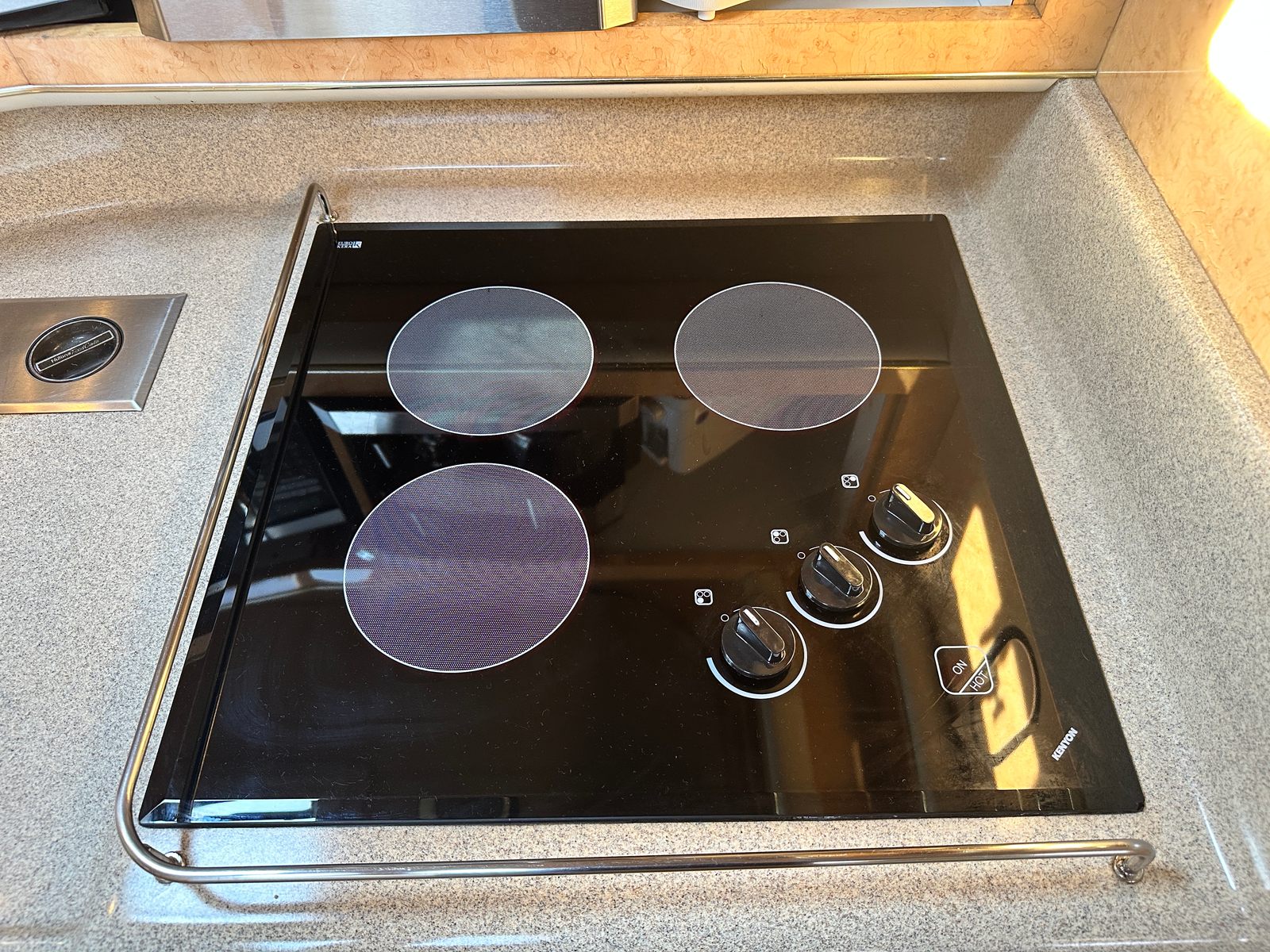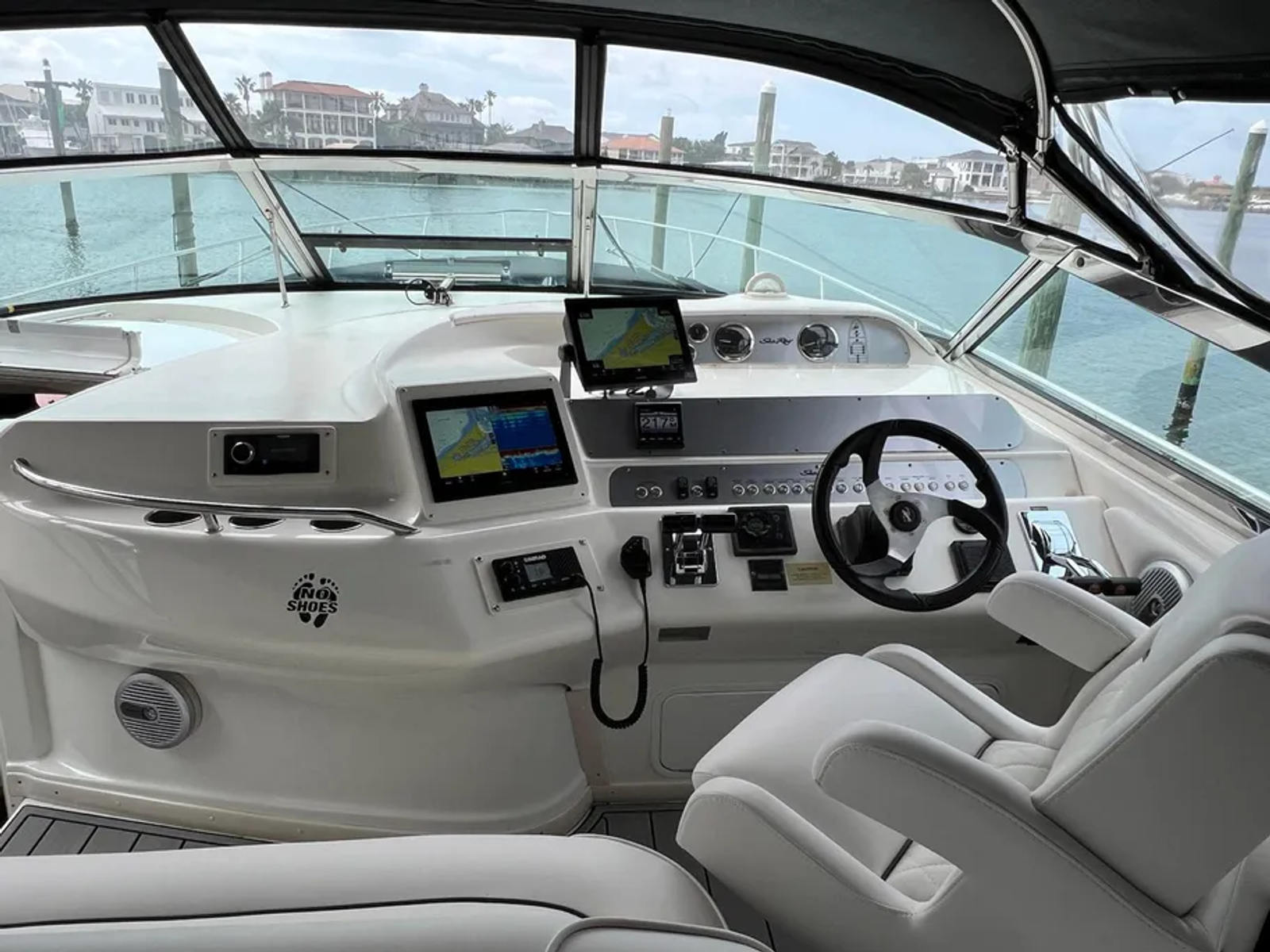 Under the hood, the Sundancer 450 is powered by twin engines, delivering a combined 840 horsepower. With only 428 engine hours, these motors promise robust performance and longevity, ensuring many more seasons of smooth cruising ahead. The dual-engine setup provides enhanced maneuverability and stability, making docking and navigating tight spaces a breeze. Whether you’re cruising along the coastline or heading out for a weekend adventure, the Sundancer 450’s powerful engines offer the speed and reliability you need for a truly exhilarating experience on the water.