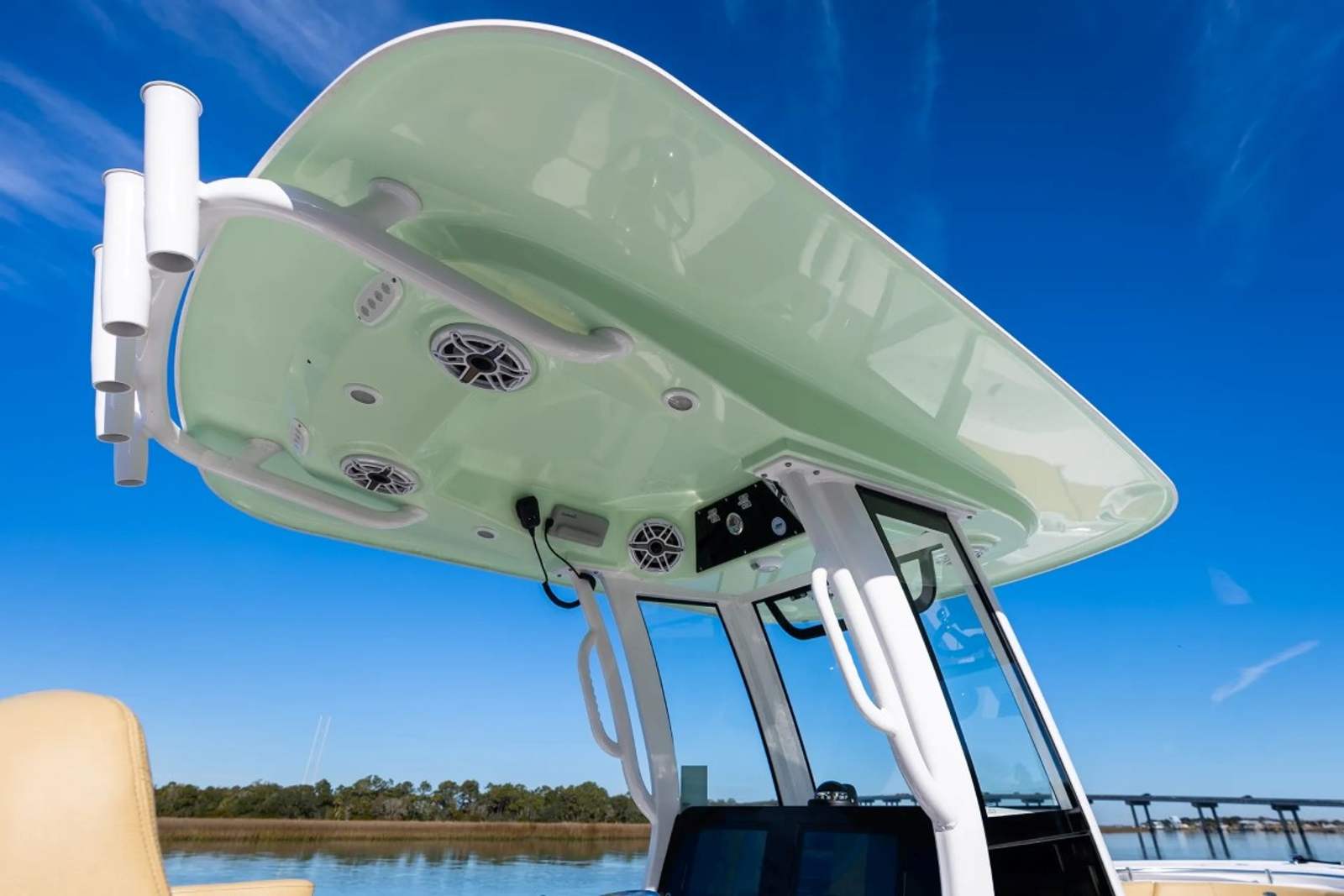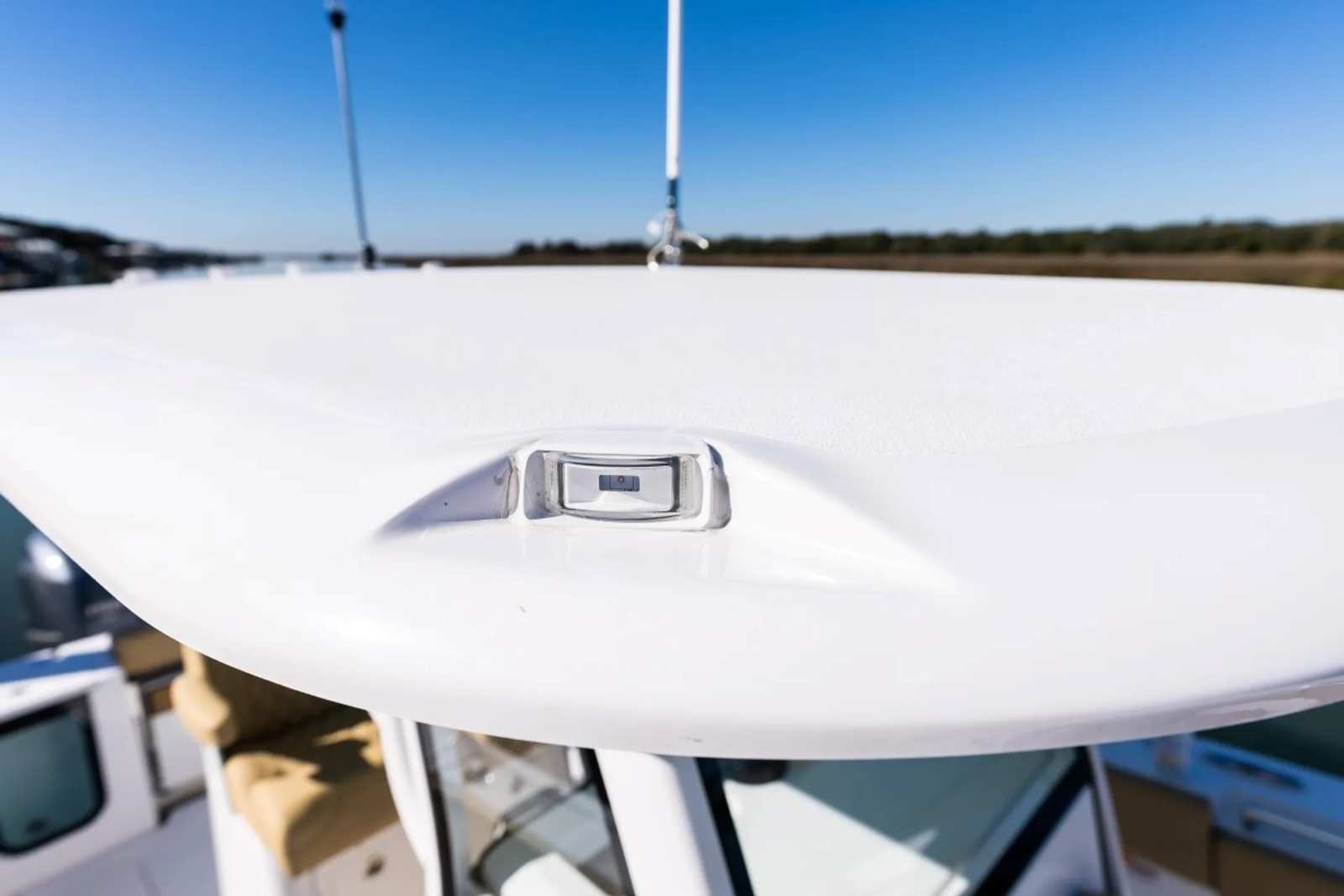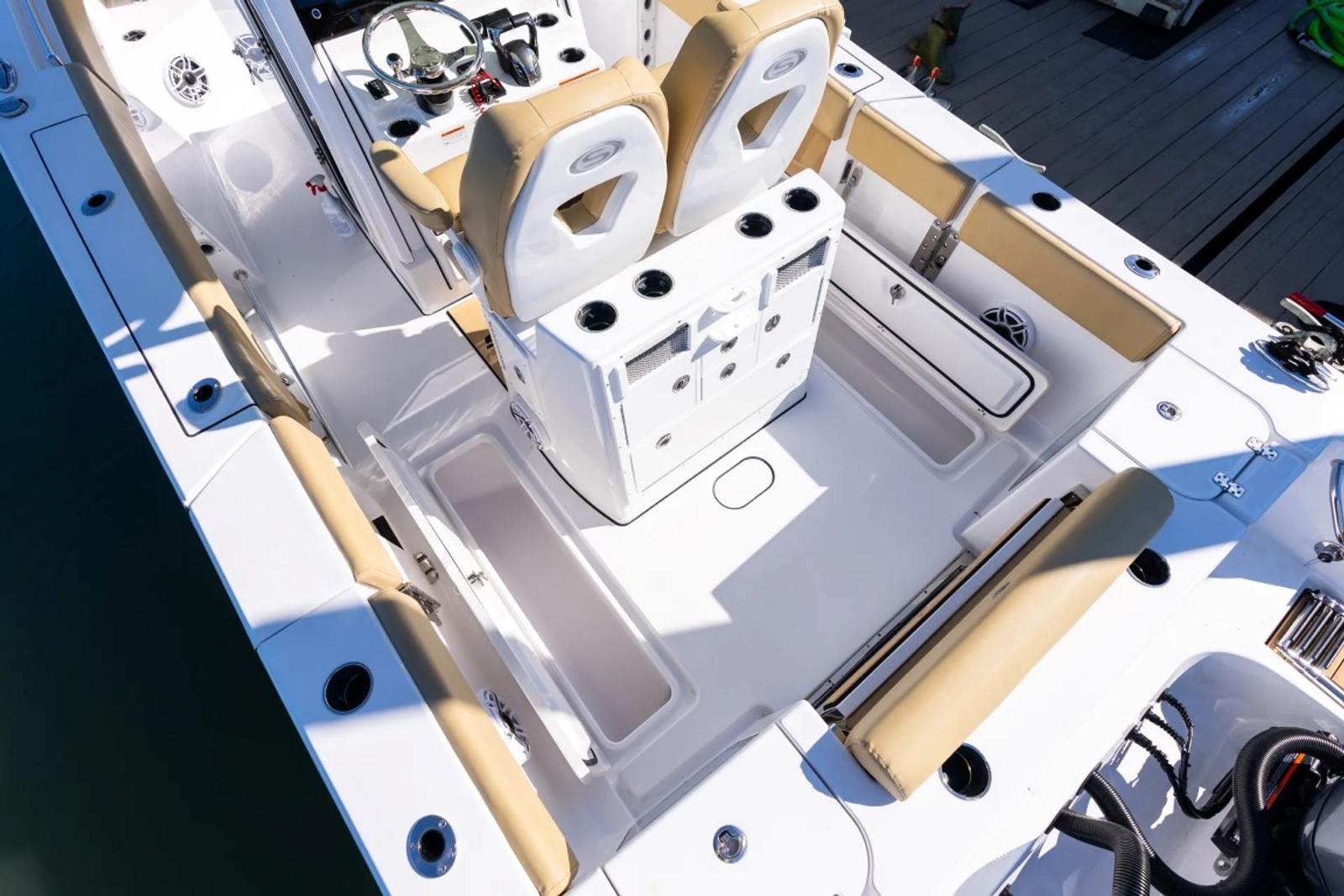 This Center Console boat is packed with premium features designed to enhance your boating experience. The fiberglass console with FG liner and cooler seat offers both durability and convenience, while the fiberglass hard top with integrated LED lighting keeps you comfortable and protected from the elements. The hardtop’s Storm Cloud Gray underside and black powder coating create a cohesive, stylish look that’s sure to turn heads at the marina.Step aboard and you’ll appreciate the Serenity Sileather Icecap White upholstery, which provides a luxurious and easy-to-clean seating surface. The fiberglass leaning post features dual premium chairs and tackle storage, making it perfect for anglers who demand both comfort and functionality. Navigation is a breeze with two Garmin 12" GPS screens equipped with built-in Wi-Fi, ensuring you stay connected and informed wherever your journey takes you. The Edson 13” stainless steel comfort grip steering wheel with PowerKnob offers precise control and effortless steering, rounding out the boat’s impressive list of amenities.