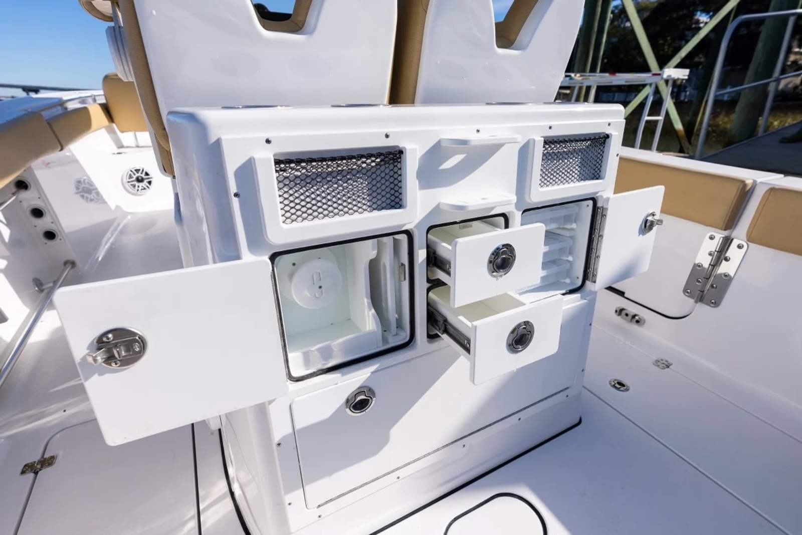 - Fiberglass Leaning Post w/ Dual Premium Chairs andTackle Storage