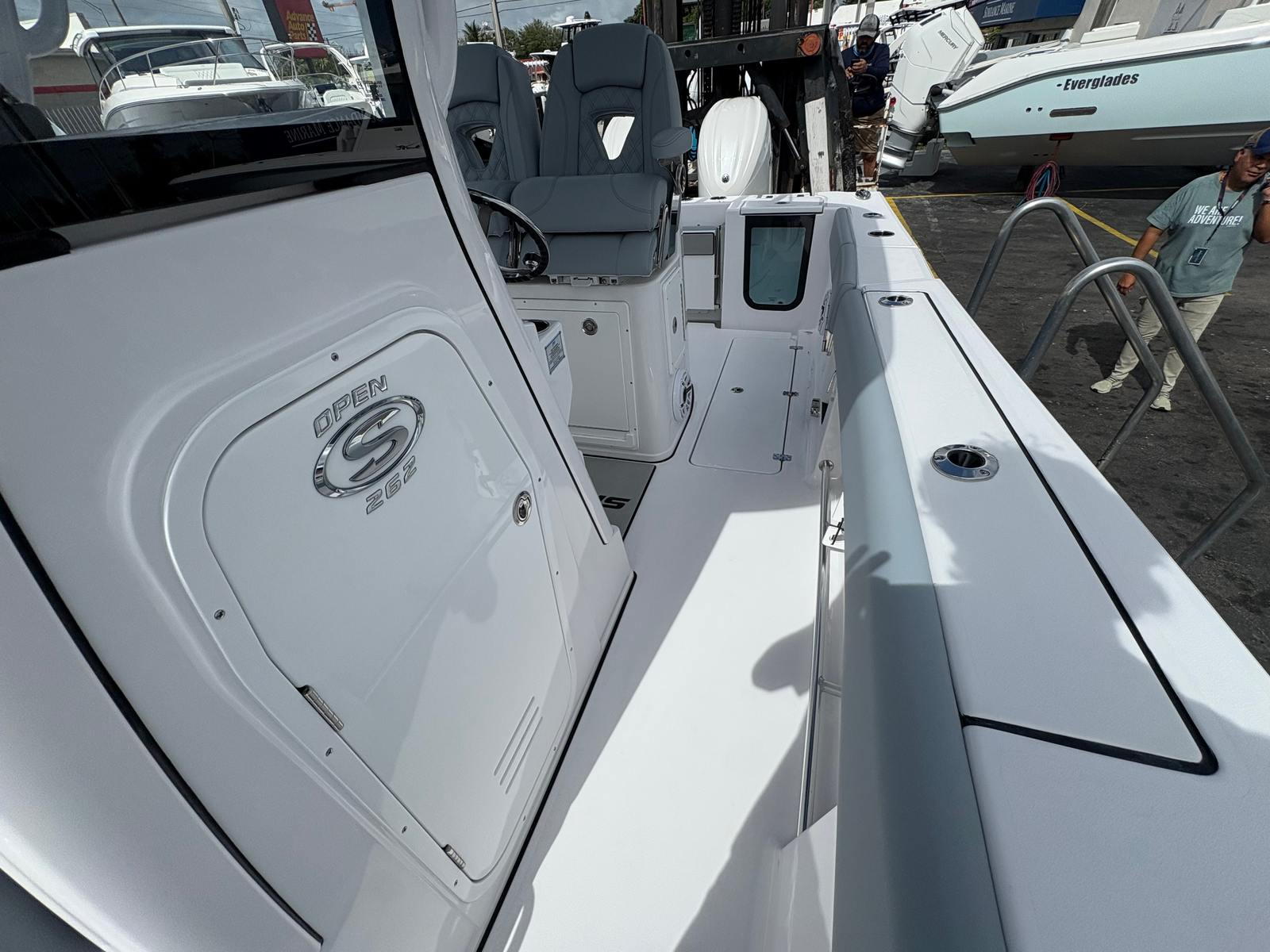 The 2026 Sportsman Open 262 is packed with premium features designed to enhance your boating experience. The fiberglass console, complete with a fiberglass liner and cooler seat, offers both durability and convenience. The fiberglass hardtop, accented with LED lighting and an Explorer Blue underside, provides shade and style, ensuring comfort during long days on the water. The white powder coating adds a touch of elegance and protection to the boat’s hardware, while the Serenity Sileather Smokey Gray upholstery delivers both luxury and resilience.For those who love to relax, the bow sundeck/table with cushion offers a perfect spot to soak up the sun or enjoy a meal with friends. The fiberglass leaning post features dual premium chairs and integrated tackle storage, making it easy to switch from cruising to fishing in seconds. Navigation and connectivity are a breeze with two Garmin 12-inch GPS screens equipped with built-in Wi-Fi, ensuring you always have the latest charts and information at your fingertips.