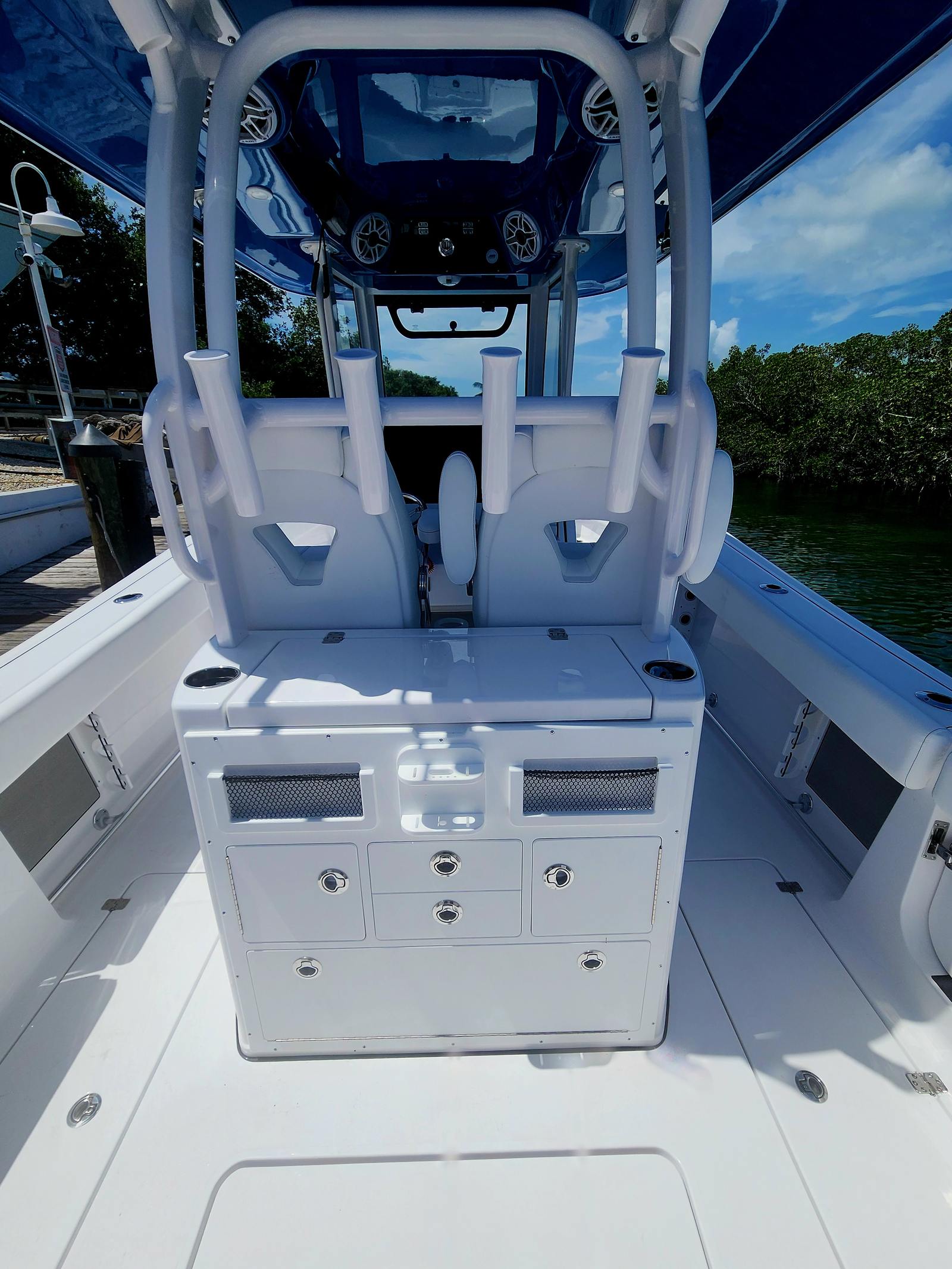 The 2026 Sportsman Open 282 is packed with premium features designed to enhance your boating experience. The twin Yamaha F300XSB engines provide reliable and efficient power, while the Edison 13" stainless steel comfort grip steering wheel with power knob ensures precise control and comfort at the helm. For anglers, the Taco Outriggers GS390 and electric reel outlets make offshore fishing a breeze, giving you the tools you need for a successful day on the water. The ProMariner ProTournament Elite 3 battery charger (4 bank) keeps your electronics powered and ready, while the trolling motor plug, harness, and adapter add even more versatility for fishing enthusiasts.The stern fiberglass cockpit table offers a convenient space for socializing, dining, or preparing your catch, making the Open 282 as comfortable for entertaining as it is for fishing. The hull’s Snow White color with an Explorer Blue bottom not only looks fantastic but also adds a layer of protection and style to your boat.