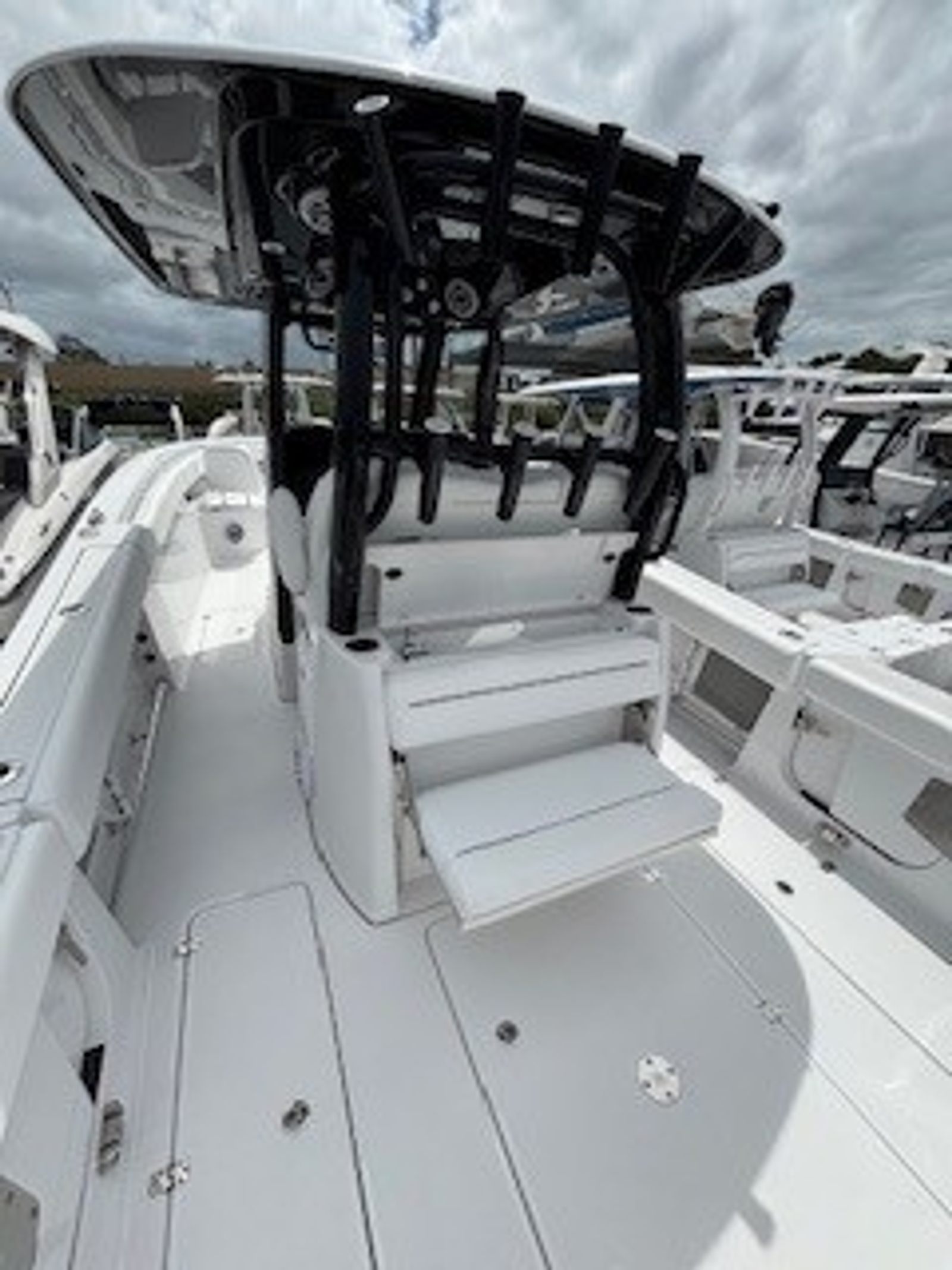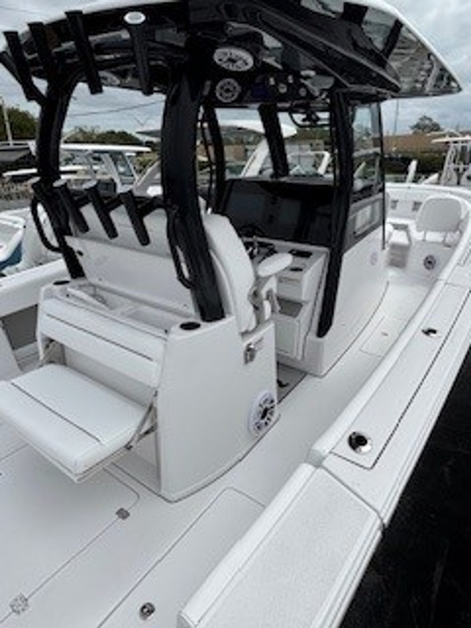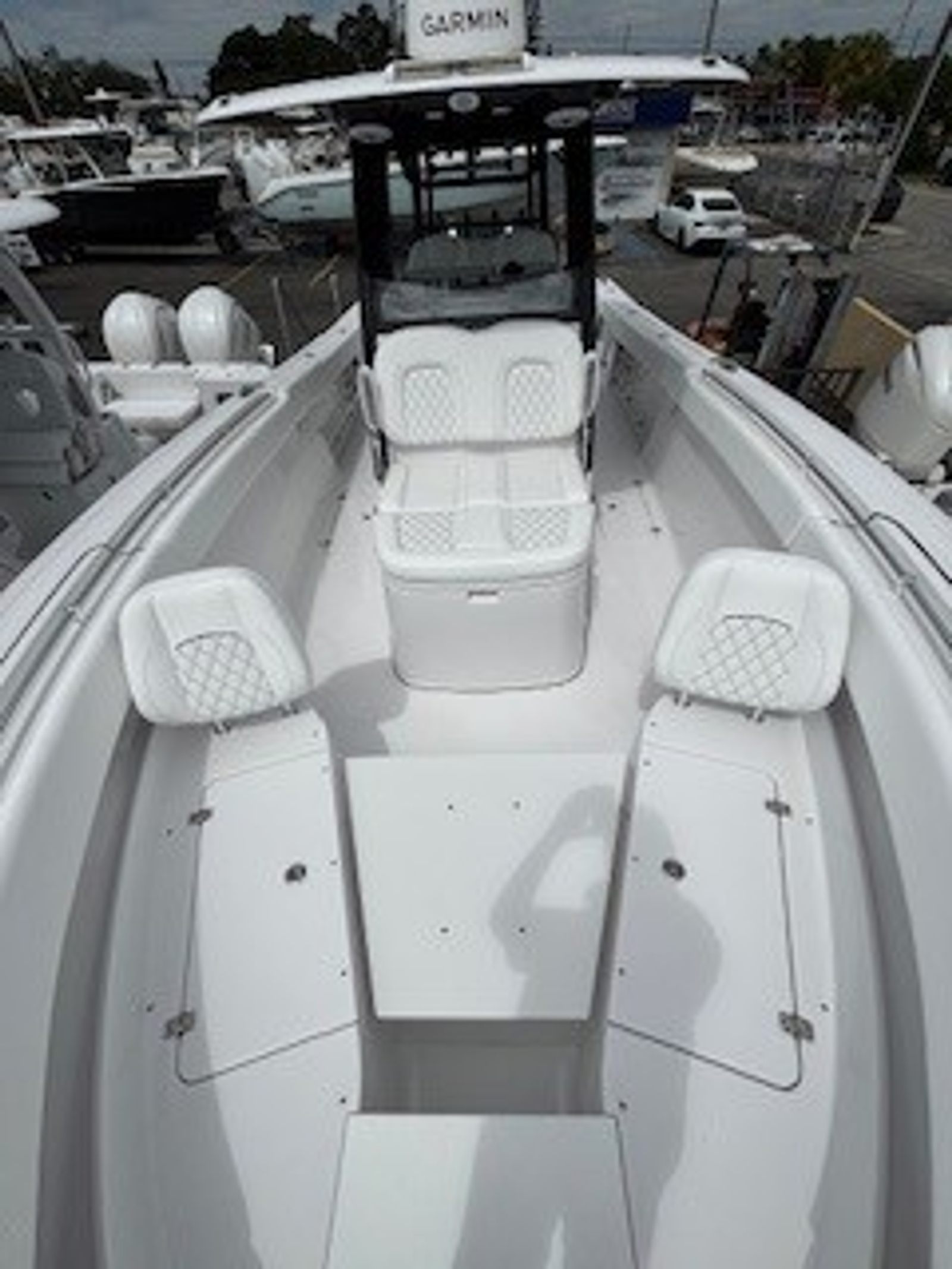 The 2026 Sportsman Open 322 is loaded with premium features that set it apart from other center console boats for sale. The fiberglass console, complete with a fiberglass liner and cooler seat, offers both durability and convenience, providing a comfortable space for the captain and guests. The fiberglass hard top, accented with LED lighting and a jet black underside, not only enhances the boat’s aesthetics but also provides essential shade and illumination for day and night outings.The black powder coating on the hardware adds a touch of sophistication, while the Serenity Sileather Icecap White upholstery ensures a luxurious and easy-to-clean seating environment. The fiberglass leaning post, featuring a rear-facing seat and sink, is perfect for entertaining or prepping for a day of fishing. The premium 60/40 bench with bolsters offers versatile seating arrangements, maximizing comfort for everyone on board.Navigation and connectivity are top-notch with two Garmin 16-inch GPS screens, each equipped with built-in Wi-Fi. These advanced displays provide real-time navigation, fish-finding capabilities, and seamless integration with your favorite marine apps, making every trip safer and more enjoyable.