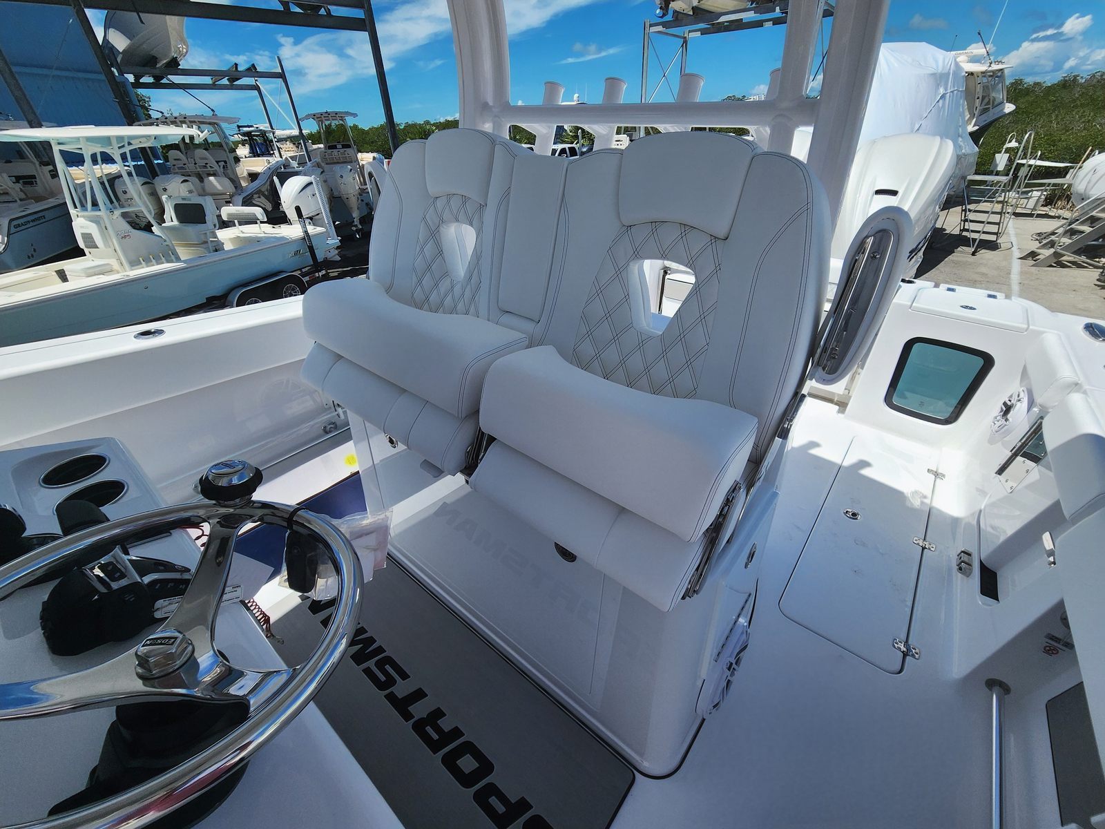 The Sportsman Open 322 is a 2026 model, measuring an impressive 32.17 feet in length. This new Center Console boat showcases the perfect blend of style and substance, making it an ideal vessel for both seasoned captains and newcomers alike. With its sleek Storm Cloud Gray hull color and matching hardtop underside, this boat commands attention at every marina and on every waterway. The white hull bottom and powder coating add a touch of elegance, while the Serenity Sileather Icecap White upholstery ensures a sophisticated and inviting atmosphere for all aboard. Whether you’re cruising along the coast or anchored at your favorite spot, the Sportsman Open 322 delivers a striking visual presence and a welcoming environment.