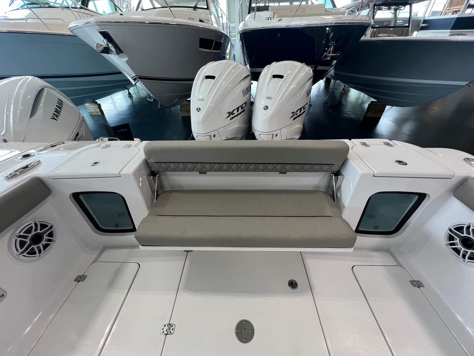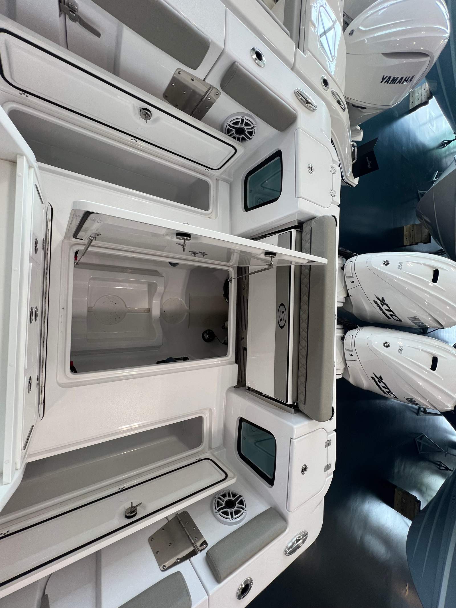 Powering the Sportsman Open 322 are twin Yamaha XF450 engines, providing a combined 900 horsepower. This impressive setup ensures exhilarating acceleration, smooth cruising, and the ability to handle a variety of water conditions with confidence. Whether you are heading offshore for a day of fishing or cruising along the coastline, the Open 322’s performance is both thrilling and reliable. The dual-engine configuration not only enhances speed and agility but also offers peace of mind with added redundancy and maneuverability, making docking and navigating tight spaces a breeze.