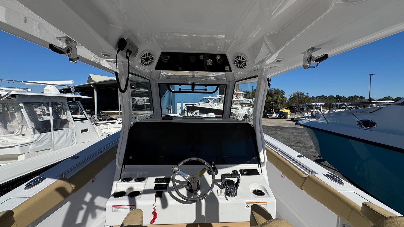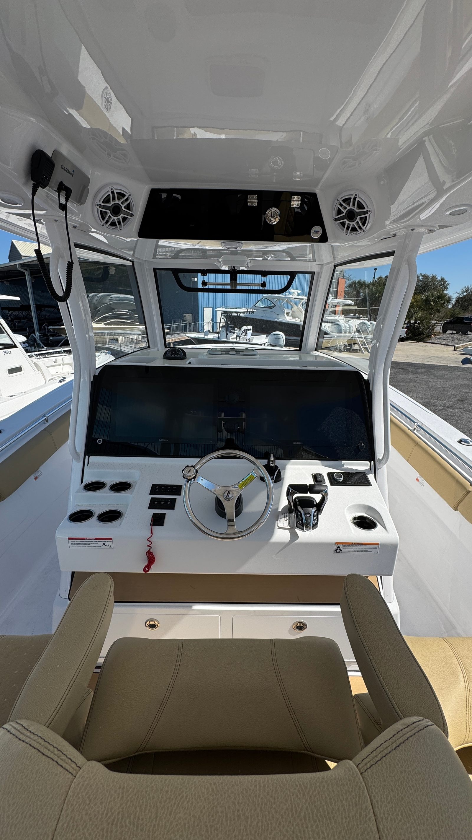 Step aboard the Sportsman Open 352 and discover a world of premium features designed to maximize comfort, convenience, and enjoyment. The air conditioning system ensures a cool and pleasant environment, perfect for hot summer days or extended trips. The hardtop underside and hull bottom, both finished in Snow White, add a touch of elegance while providing protection from the elements. Electric reel outlets cater to serious anglers, making this Center Console boat for sale an excellent choice for fishing enthusiasts. The Garmin GXM™ 54 SiriusXM® Weather Antenna keeps you informed with real-time weather updates, enhancing safety and planning for every outing. The powder coating in white and Desert Tan upholstery create a sophisticated and inviting atmosphere, while the triple Yamaha engines deliver unmatched power and reliability.