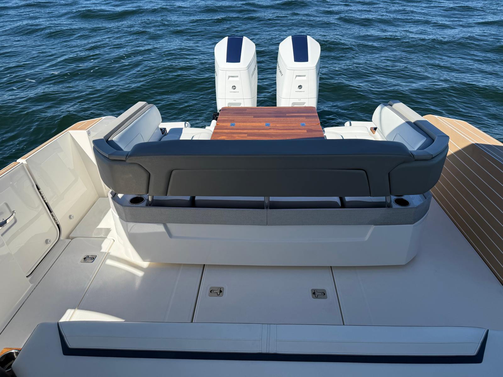 yacht with no wait time. Powered by twin Mercury 600hp V12 outboards with less than 80 hours, this vessel offers