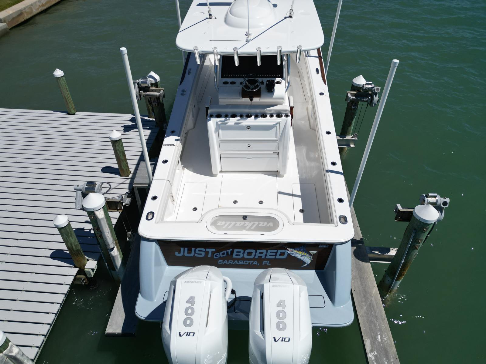 Powered by twin engines delivering a total of 800 horsepower and only 46 engine hours, the V33 promises exhilarating performance and reliability for every outing. The patented Stepped-V Ventilated Tunnel delivers the softest, driest, and most efficient ride of any center console in this size range. This V-33 possesses big-boat technology. It is loaded with nearly every option available including a Seakeeper 2 and Zipwake trim tabs to further improve the legendary Valhalla ride. The V-33 was designed for maximum live well and fish box capacity. A standard 52-gallon transom live well anchors the cockpit, and five overboard-draining in-deck fish boxes from 32 to 98 gallons are strategically positioned so you’re never more than a half-step from a home for your catch. The hardtop package comes with an assortment of accessories (Lumitec spreader lights, a six-rod rocket launcher and overhead electronics and radar pods) that’ll keep you battle-ready 24/7.